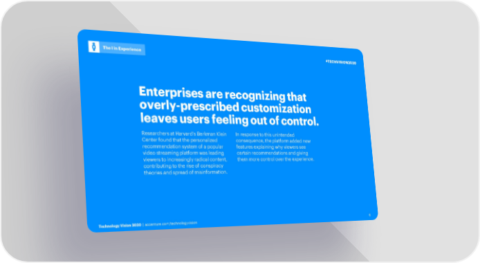 The I in Experience #TECHVISION2020 Enterprises are recognizing that overly-prescribed customization leaves users feeling out of control. Researchers at Harvard’s Berkman Klein In response to this unintended Center found that the personalized consequence, the platform added new recommendation system of a popular features explaining why viewers see video streaming platform was leading certain recommendations and giving viewers to increasingly radical content, them more control over the experience. contributing to the rise of conspiracy theories and spread of misinformation. Technology Vision 2020 | accenture.com/technologyvision 6