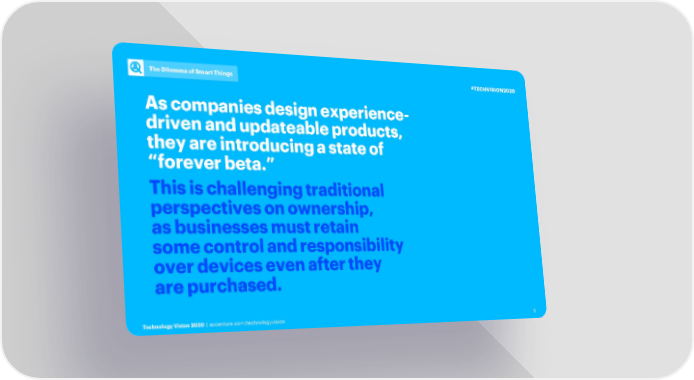 The Dilemma of Smart Things #TECHVISION2020 As companies design experience- driven and updateable products, they are introducing a state of “forever beta.” This is challenging traditional perspectives on ownership, as businesses must retain some control and responsibility over devices even after they arepurchased. Technology Vision 2020 | accenture.com/technologyvision 5