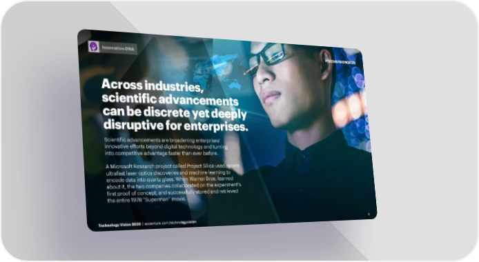 Innovation DNA #TECHVISION2020 Across industries, scientific advancements can be discrete yet deeply disruptive for enterprises. Scientific advancements are broadening enterprises’ innovative efforts beyond digital technology and turning into competitive advantage faster than ever before. A Microsoft Research project called Project Silica used recent ultrafast laser optics discoveries and machine learning to encode data into quartz glass. When Warner Bros. learned about it, the two companies collaborated on the experiment’s first proof of concept, and successfully stored and retrieved the entire 1978 “Superman” movie. TeTechchnnoolologygy VisVisioionn 22002200 | | accaccentuenturere..ccomom//tteecchhnnolooogygyvvisioisionn 6