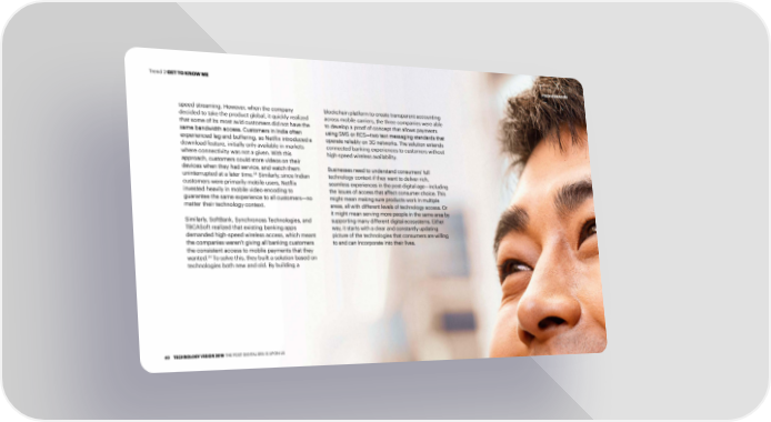 Trend 2 GET TO KNOW ME #T#TEECCHHVVIISSIIOONN22001199 speed streaming. However, when the company blockchain platform to create transparent accounting decided to take the product global, it quickly realized across mobile carriers, the three companies were able that some of its most avid customers did not have the to develop a proof of concept that allows payments same bandwidth access. Customers in India often using SMS or RCS—two text messaging standards that experienced lag and buffering, so Netflix introduced a operate reliably on 3G networks. The solution extends download feature, initially only available in markets connected banking experiences to customers without where connectivity was not a given. With this high-speed wireless availability. approach, customers could store videos on their devices when they had service, and watch them Businesses need to understand consumers’ full uninterrupted at a later time.23 Similarly, since Indian technology context if they want to deliver rich, customers were primarily mobile users, Netflix seamless experiences in the post-digital age—including invested heavily in mobile video encoding to the issues of access that affect consumer choice. This guarantee the same experience to all customers—no might mean making sure products work in multiple matter their technology context. areas, all with different levels of technology access. Or it might mean serving more people in the same area by Similarly, SoftBank, Synchronoss Technologies, and supporting many different digital ecosystems. Either TBCASoft realized that existing banking apps way, it starts with a clear and constantly updating demanded high-speed wireless access, which meant picture of the technologies that consumers are willing the companies weren’t giving all banking customers to and can incorporate into their lives. the consistent access to mobile payments that they wanted.24 To solve this, they built a solution based on technologies both new and old. By building a 40 TECHNOLOGY VISION 2019 THE POST-DIGITAL ERA IS UPON US