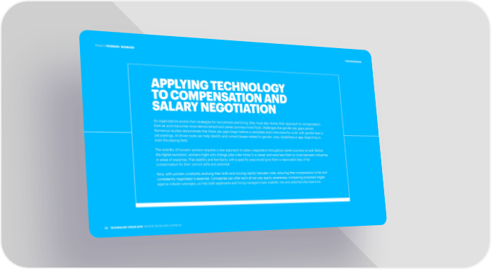 Trend 3 HUMAN+ WORKER #TECHVISION2019 APPLYING TECHNOLOGY TO COMPENSATION AND SALARY NEGOTIATION As organizations evolve their strategies for recruitment and hiring, they must also review their approach to compensation. Even as work becomes more democratized and career journeys more fluid, challenges like gender pay gaps persist. Numerous studies demonstrate that these pay gaps begin before a candidate even interviews for a job, with gender bias in job postings. AI-driven tools can help identify and correct biases related to gender, race, disabilities or age, beginning to even the playing field. The mobility of human+ workers requires a new approach to salary negotiation throughout career journeys as well. Before the digital revolution, workers might only change jobs a few times in a career and were less likely to cross between industries or areas of expertise. That stability and familiarity with a specific area would give them a reasonable idea of fair compensation for their current skills and potential. Now, with workers constantly evolving their skills and moving rapidly between roles, ensuring that compensation is fair and consistently negotiated is essential. Companies can offer tech-driven pay equity awareness, comparing proposed wages against industry averages, so that both applicants and hiring managers have visibility into any potential discrepancies. 50 TECHNOLOGY VISION 2019 THE POST-DIGITAL ERA IS UPON US