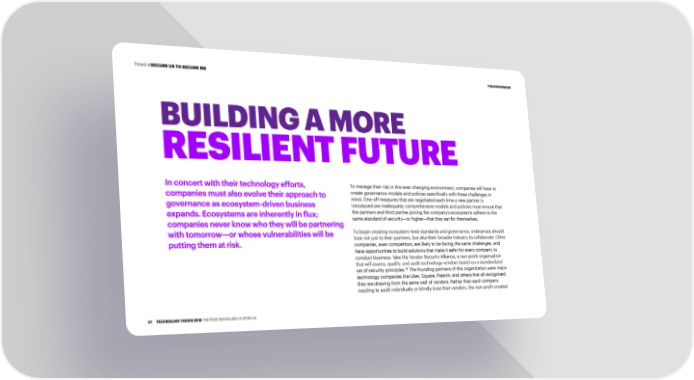 Trend 4 SECURE US TO SECURE ME #TECHVISION2019 BUILDING A MORE RESILIENT FUTURE In concert with their technology efforts, To manage their risk in this ever-changing environment, companies will have to companies must also evolve their approach to create governance models and policies specifically with these challenges in mind. One-off measures that are negotiated each time a new partner is governance as ecosystem-driven business introduced are inadequate; comprehensive models and policies must ensure that expands. Ecosystems are inherently in flux; the partners and third parties joining the company’s ecosystems adhere to the companies never know who they will be partnering same standard of security—or higher—that they set for themselves. with tomorrow—or whose vulnerabilities will be To begin creating ecosystem-level standards and governance, enterprises should look not just to their partners, but also their broader industry to collaborate. Other putting them at risk� companies, even competitors, are likely to be facing the same challenges, and have opportunities to build solutions that make it safer for every company to conduct business. Take the Vendor Security Alliance, a non-profit organization that will assess, qualify, and audit technology vendors based on a standardized set of security principles.28 The founding partners of this organization were major technology companies like Uber, Square, Palantir, and others that all recognized they are drawing from the same well of vendors. Rather than each company needing to audit individually or blindly trust their vendors, the non-profit created 67 TECHNOLOGY VISION 2019 THE POST-DIGITAL ERA IS UPON US