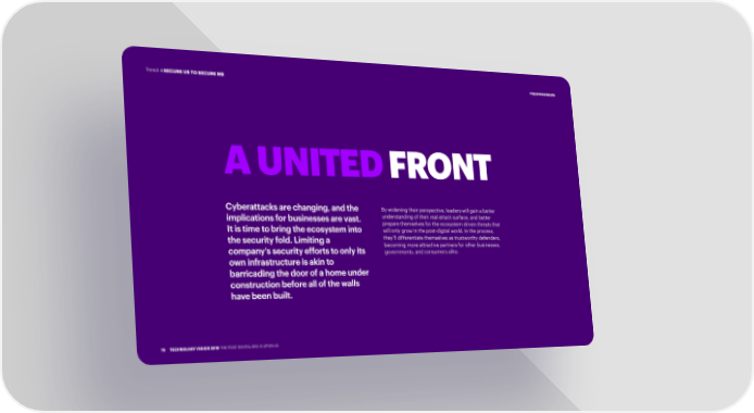 Trend 4 SECURE US TO SECURE ME #TECHVISION2019 A UNITED FRONT Cyberattacks are changing, and the By widening their perspective, leaders will gain a better implications for businesses are vast� understanding of their real attack surface, and better prepare themselves for the ecosystem-driven threats that It is time to bring the ecosystem into will only grow in the post-digital world. In the process, the security fold� Limiting a they’ll differentiate themselves as trustworthy defenders, becoming more attractive partners for other businesses, company’s security efforts to only its governments, and consumers alike. own infrastructure is akin to barricading the door of a home under construction before all of the walls have been built� 70 TECHNOLOGY VISION 2019 THE POST-DIGITAL ERA IS UPON US