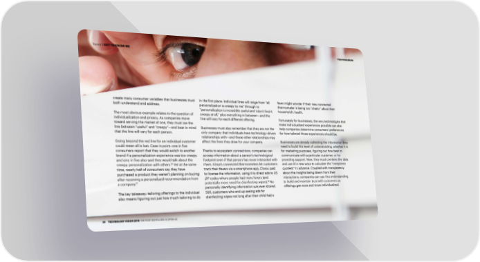 Trend 2 GET TO KNOW ME #TECHVISION2019 create many consumer variables that businesses must in the first place. Individual lines will range from “all fever might wonder if their new connected both understand and address. personalization is creepy to me” through to thermometer is being too “chatty” about their “personalization is incredibly useful and I don’t find it household’s health. The most obvious example relates to the question of creepy at all,” plus everything in between—and the individualization and privacy. As companies move line will vary for each different offering. Fortunately for businesses, the very technologies that toward serving the market of one, they must toe the make individualized experiences possible can also line between “useful” and “creepy”—and bear in mind Businesses must also remember that they are not the help companies determine consumers’ preferences that the line will vary for each person. only company that individuals have technology-driven for how tailored those experiences should be. relationships with—and those other relationships may Going beyond the red line for an individual customer affect the lines they draw for your company. Businesses are already collecting the information they could mean all is lost. Case in point: one in five need to build this level of understanding, whether it is consumers report that they would switch to another Thanks to ecosystem connections, companies can for marketing purposes, figuring out how best to brand if a personalization experience was too creepy, access information about a person’s technological communicate with a particular customer, or for and one in five also said they would talk about the footprint even if that person has never interacted with providing support. Now, they must combine the data 16 creepy personalization with others. Yet at the same them. Kinsa’s connected thermometers let customers and use it in new ways to calculate the “creepiness time, nearly half of consumers say they have track their fevers via a smartphone app; Clorox paid quotient” in advance. Coupled with transparency purchased a product they weren’t planning on buying to license the information, using it to direct ads to US about the insights being drawn from their after receiving a personalized recommendation from ZIP codes where people had more fevers (and interactions, companies can use this understanding 17 18 a company. potentially more need for disinfecting wipes). No to build and maintain trust with customers as personally identifying information was ever shared. offerings get more and more individualized. The key takeaway: tailoring offerings to the individual Still, customers who end up seeing ads for also means figuring out just how much tailoring to do disinfecting wipes not long after their child had a 36 TECHNOLOGY VISION 2019 THE POST-DIGITAL ERA IS UPON US