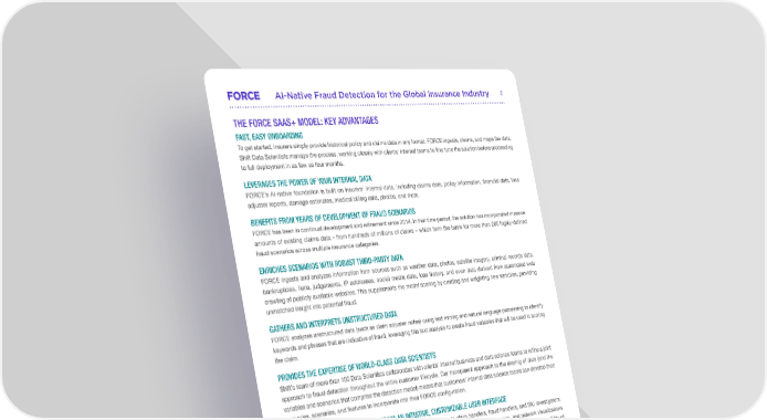 AI-Native Fraud Detection for the Global Insurance Industry 2 THE FORCE SAAS+ MODEL: KEY ADVANTAGES FAST, EASY ONBOARDING To get started, insurers simply provide historical policy and claims data in any format. FORCE ingests, cleans, and maps the data. Shift Data Scientists manage the process, working closely with clients' internal teams to fine tune the solution before proceeding to full deployment in as few as four months. LEVERAGES THE POWER OF YOUR INTERNAL DATA FORCE’s AI-native foundation is built on insurers’ internal data, including claims data, policy information, financial data, loss adjuster reports, damage estimates, medical billing data, photos, and more. BENEFITS FROM YEARS OF DEVELOPMENT OF FRAUD SCENARIOS FORCE has been in continual development and refinement since 2014. In that time period, the solution has incorporated massive amounts of existing claims data – from hundreds of millions of claims – which form the basis for more than 200 highly-defined fraud scenarios across multiple insurance categories. ENRICHES SCENARIOS WITH ROBUST THIRD-PARTY DATA FORCE ingests and analyzes information from sources such as weather data, photos, satellite imagery, criminal records data, bankruptcies, liens, judgements, IP addresses, social media data, loss history, and even data derived from automated web crawling of publicly available websites. This supplements the model scoring by creating and weighting new variables, providing unmatched insight into potential fraud. GATHERS AND INTERPRETS UNSTRUCTURED DATA FORCE analyzes unstructured data (such as claim adjuster notes) using text mining and natural language processing to identify keywords and phrases that are indicative of fraud, leveraging this text analysis to create fraud variables that will be used in scoring the claim. PROVIDES THE EXPERTISE OF WORLD-CLASS DATA SCIENTISTS Shift’s team of more than 100 Data Scientists collaborates with clients’ internal business and data science teams to refine a joint approach to fraud detection throughout the entire customer lifecycle. Our transparent approach to the sharing of data (and the variables and scenarios that comprise the detection model) means that customers’ internal data science teams can develop their own rules, scenarios, and features to incorporate into their FORCE configuration. DELIVERS ACTIONABLE CLAIM ALERTS VIA AN INTUITIVE, CUSTOMIZABLE USER INTERFACE FORCE provides prioritized, scored individual and network fraud alerts to claim handlers, fraud handlers, and SIU investigators. They can easily view and manage fraud scenarios and indicators, along with third-party data, maps, and network visualizations in a single interface, without having to refer to multiple data sources externally. Investigators can quickly determine the validity of claims and prioritize their efforts where the ROI is greatest instead of wasting time on triage and research. AUTO HEALTH HOMEOWNERS’ TRAVEL WORKERS' DISABILITY LIFE COMPENSATION Tap into the power of AI-native fraud detection today. Visit shift-technology.com shift-technology.com