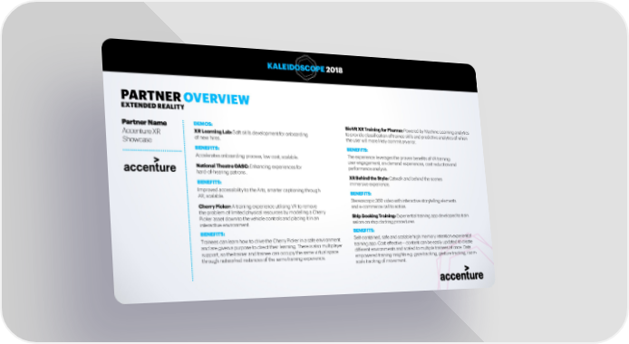 KALEIDOSCOPE 2018 PARTNER OVERVIEW EXTENDED REALITY Partner Name DEMOS: BioVR XR Training for Pharma: Powered by Machine Learning analytics Accenture XR XR Learning Lab: Soft skills development for onboarding to provide classification of trainee skills and predictive analytics of when of new hires. the user will more likely commit an error. Showcase BENEFITS: BENEFITS: Accelerates onboarding process, low cost, scalable. The experience leverages the proven benefits of VR training: user engagement, on-demand experiences, cost reduction and National Theatre OASC: Enhancing experiences for performance analysis. hard-of-hearing patrons . XR Behind the Style: Catwalk and behind the scenes BENEFITS: immersive experience. Improved accessibility to the Arts, smarter captioning through BENEFITS: AR, scalable. Stereoscopic 360 video with interactive storytelling elements Cherry Picker: A training experience utilising VR to remove and e-commerce call to action. the problem of limited physical resources by modelling a Cherry Picker asset down to the vehicle controls and placing it in an Ship Docking Training: Experiential training app developed to train interactive environment. sailors on ship docking procedures. BENEFITS: BENEFITS: Trainees can learn how to drive the Cherry Picker in a safe environment Self-contained, safe and scalable high memory retention experiential and are given a purpose to direct their learning. There is also multiplayer training app. Cost effective – content can be easily updated to create support, so the trainer and trainee can occupy the same virtual space different environments and scaled to multiple trainees at once. Data through networked instances of the same training experience. empowered training insights e.g. gaze tracking, gesture tracking, room- scale tracking of movement. 24