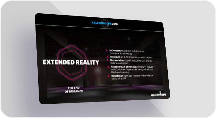 KALEIDOSCOPE 2018 1. InContext: Mixed Reality for in-store Customer Experiences 2. TeslaSuit: VR & AR Experiences with Haptics 3. Mackevision: Digital Twin using CGI and 3D Data Visualisation 4. Accenture XR Showcase: Immersive Industry and Customer Experiences using AR, VR and Machine Learning 5. KageNova: Next-gen Immersive Experience using VR & MR THE END OF DISTANCE 5