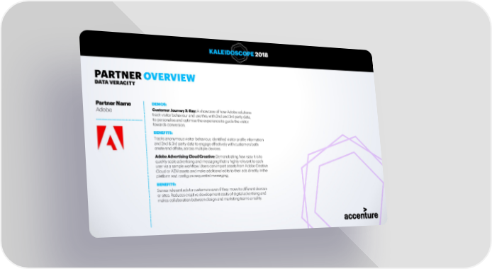 KALEIDOSCOPE 2018 PARTNER OVERVIEW DATA VERACITY Partner Name DEMOS: Adobe Customer Journey X-Ray: A showcase of how Adobe solutions track visitor behaviour and use this, with 2nd and 3rd party data, to personalise and optimise the experience to guide the visitor towards conversion. BENEFITS: Tracks anonymous visitor behaviour, identified visitor profile information and 2nd & 3rd party data to engage effectively with customers both onsite and offsite, across multiple devices. Adobe Advertising Cloud Creative: Demonstrating how easy it is to quickly scale advertising and messaging that is highly relevant to each user via a sample workflow. Users can import assets from Adobe Creative Cloud or AEM assets and make additional edits to their ads directly in the platform and configure sequential messaging. BENEFITS: Serves relevant ads to customers even if they move to different devices or sites. Reduces creative development costs of digital advertising and makes collaboration between design and marketing teams a reality. 28