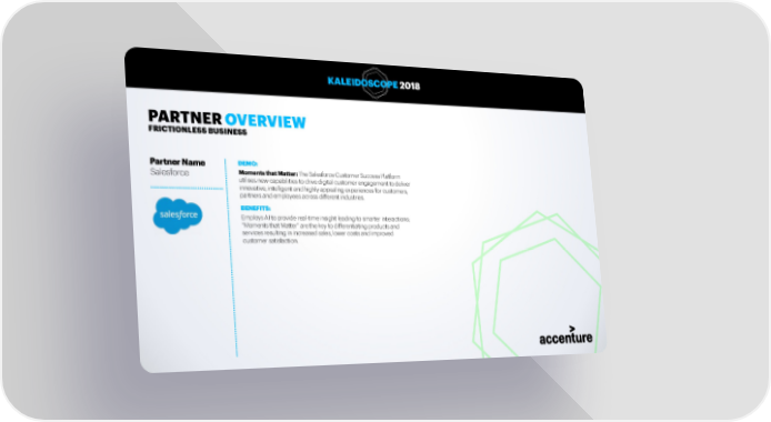 KALEIDOSCOPE 2018 PARTNER OVERVIEW FRICTIONLESS BUSINESS Partner Name DEMO: Salesforce Moments that Matter: The Salesforce Customer Success Platform utilises new capabilities to drive digital customer engagement to deliver innovative, intelligent and highly appealing experiences for customers, partners and employees across different industries. BENEFITS: Employs AI to provide real-time insight leading to smarter interactions; “Moments that Matter” are the key to differentiating products and services resulting in increased sales, lower costs and improved customer satisfaction. 39