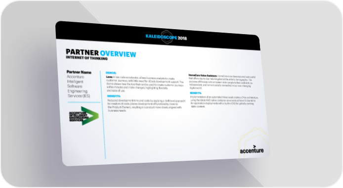 KALEIDOSCOPE 2018 PARTNER OVERVIEW INTERNET OF THINKING Partner Name DEMOS: HomeCare Voice Assistant: HomeCare is an Alexa app and web portal Accenture Lava: A low code accelerator, allows business analysts to create that offers day-to-day help targeted at the elderly demographic. The customer journeys, with little need for dCode development support. This purpose of this app is to empower older people to feel confident, be Intelligent demo shows how the tool that can be used to create customer journeys independent, and remain socially connected in our ever-changing Software within minutes and make changes, highlighting flexibility digital world. Engineering and ease of use. BENEFITS: Services (IES) BENEFITS: Implementation of an automated Alexa asset creates a 2-tier architecture, Reduced development time and costs by applying a ‘shift level approach’ using the latest AWS native container services to achieve 0-downtime to creation of code; places development of functionality closer to for application deployments with a built-in CND for globally caching the Product Owners, resulting in a product more closely aligned with static content. business needs. 58