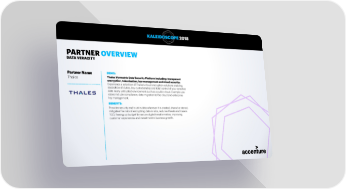 KALEIDOSCOPE 2018 PARTNER OVERVIEW DATA VERACITY Partner Name DEMO: Thales Thales Vormetric Data Security Platform including: transparent encryption, tokenisation, key management and cloud security: Experience a selection of Thales’s cloud encryption solutions enabling separation of duties, key custodianship and total control of your sensitive data in any untrusted environment such as a public cloud. Example use- cases include compliance, data migration to the cloud and enterprise key management. BENEFITS: Provides security and trust in data wherever it is created, shared or stored; mitigates the risks of encrypting data in silos, reduces threats and lowers TCO, freeing up budget for secure digital transformation, improving customer experiences and investment in business growth. 36