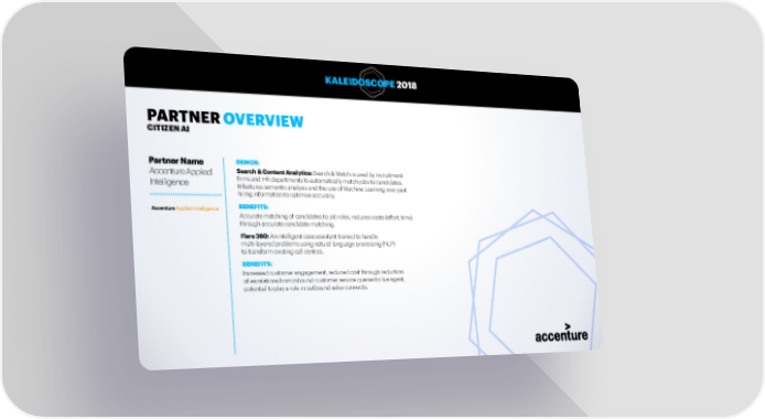KALEIDOSCOPE 2018 PARTNER OVERVIEW CITIZEN AI Partner Name DEMOS: Accenture Applied Search & Content Analytics: Search & Match is used by recruitment Intelligence firms and HR departments to automatically match jobs to candidates. It features semantic analysis and the use of Machine Learning over past hiring information to optimise accuracy. BENEFITS: Accurate matching of candidates to job roles, reduces costs (effort, time) through accurate candidate matching. Flare 360: An intelligent case assistant trained to handle multi-layered problems using natural language processing (NLP) to transform existing call centres. BENEFITS: Increased customer engagement; reduced cost through reduction of escalations from inbound customer service queries to live agent; potential to play a role in outbound sales connects. 18