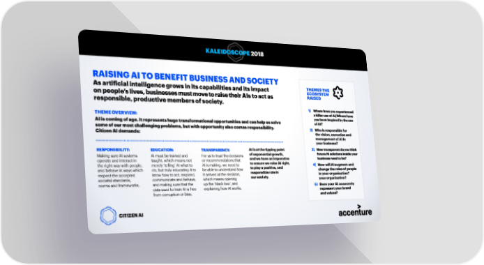 KALEIDOSCOPE 2018 RAISING AI TO BENEFIT BUSINESS AND SOCIETY As artificial intelligence grows in its capabilities and its impact THEMES THE ECOSYSTEM on people’s lives, businesses must move to raise their AIs to act as RAISED responsible, productive members of society. 1) Where have you experienced THEME OVERVIEW: a killer use of AI/Where have you been inspired by the use AI is coming of age. It represents huge transformational opportunities and can help us solve of AI? some of our most challenging problems, but with opportunity also comes responsibility. 2) Who is responsible for Citizen AI demands: the vision, execution and management of AI in your business? RESPONSIBILITY: EDUCATION: TRANSPARENCY: AI is at the tipping point 3) How transparent do you think Making sure AI systems AI must be trained and For us to trust the decisions of exponential growth, future AI solutions inside your operate and interact in taught, which means not or recommendations that and we have an imperative business need to be? the right way with people, merely ‘telling’ AI what to AI is making, we need to to ensure we raise AI right, 4) How will AI augment and and behave in ways which do, but truly educating it to be able to understand how to play a positive, and change the roles of people respect the accepted know how to act, respond, it arrived at the decision, responsible role in in your organisation? societal standards, communicate and behave, which means opening our society. your organisation? norms and frameworks. and making sure that the up the ‘black box’, and 5) Does your AI accurately data used to train AI is free explaining how AI works. represent your brand from corruption or bias. and values? CITIZEN AI 10