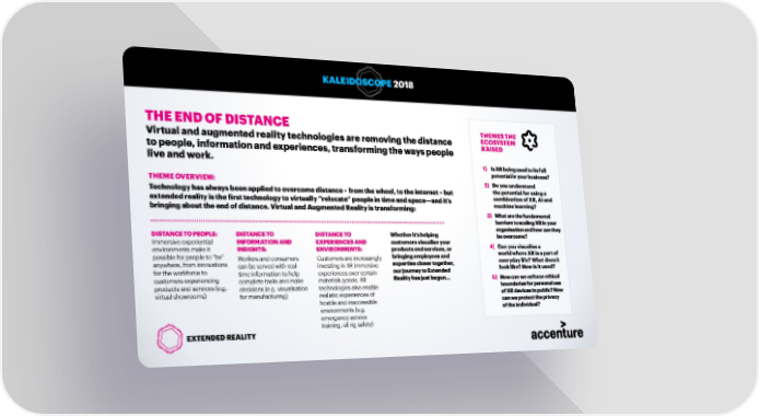 KALEIDOSCOPE 2018 THE END OF DISTANCE THEMES THE Virtual and augmented reality technologies are removing the distance ECOSYSTEM to people, information and experiences, transforming the ways people RAISED live and work. 1) Is XR being used to its full potential in your business? THEME OVERVIEW: 2) Do you understand Technology has always been applied to overcome distance – from the wheel, to the internet – but the potential for using a extended reality is the first technology to virtually “relocate” people in time and space—and it’s combination of XR, AI and bringing about the end of distance. Virtual and Augmented Reality is transforming: machine learning? 3) What are the fundamental barriers to scaling XR in your organisation and how can they DISTANCE TO PEOPLE: DISTANCE TO DISTANCE TO Whether it’s helping be overcome? Immersive experiential INFORMATION AND EXPERIENCES AND customers visualise your environments make it INSIGHTS: ENVIRONMENTS: products and services, or 4) Can you visualise a possible for people to “be” Workers and consumers Customers are increasingly bringing employees and world where XR is a part of anywhere, from innovations can be served with real- investing in XR immersive expertise closer together, everyday life? What does it for the workforce to time information to help experiences over certain our journey to Extended look like? How is it used? customers experiencing complete tasks and make materials goods. XR Reality has just begun... 5) How can we enforce ethical products and services (e.g. decisions (e.g. visualisation technologies also enable boundaries for personal use virtual showrooms) for manufacturing) realistic experiences of of XR devices in public? How hostile and inaccessible can we protect the privacy environments (e.g. of the individual? emergency service training, oil rig safety) EXTENDED REALITY 20