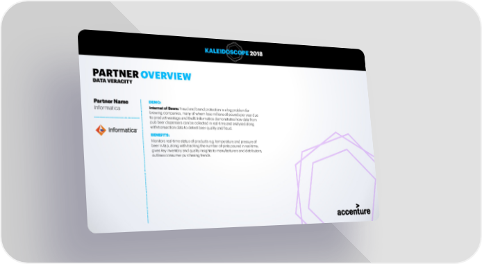 KALEIDOSCOPE 2018 PARTNER OVERVIEW DATA VERACITY Partner Name DEMO: Informatica Internet of Beers: Fraud and brand protection is a big problem for brewing companies, many of whom lose millions of pounds per year due to product wastage and theft. Informatica demonstrates how data from pub beer dispensers can be collected in real-time and analysed along with transaction data to detect beer quality and fraud. BENEFITS: Monitors real-time status of products e.g. temperature and pressure of beer in tap, along with tracking the number of pints poured in real-time; gives key inventory and quality insights to manufacturers and distributors; outlines consumer purchasing trends. 31