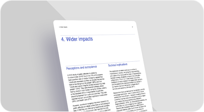 4. Wider impacts 27 4. Wider impacts Perceptions and acceptance Societal implications A 2012 study of public attitudes to robots by The application of robots opens up a number of f Eurobarometer (2012) found that 70% of Europeans implications on society, including the responsibilities had a positive view of robots. A majority agreed that and rights of the robots and the lines of responsibilities “robots are necessary as they can do jobs that are too between owners, designers, programmers and other hard or too dangerous for people” (88%) and that collaborators. This in turn raises issues around the “robots are a good thing for society because they help distribution of value between the supply chain partners people” (76%). They were however unhappy about and the potential for robot ownership to be located in having robots in their homes caring for children, elderly tax havens free from the human complexities of or the disabled; 60% of respondents thought they domicile and residency (Ahmed, 2017). should be banned from such care activities. They also Researchers have pointed out that tax policies currently reported concern around their application in education encourage automation – even in cases where human (34%) and health care (27%). workers are more efficient – because it enables firms to However, we should recognise that most research into avoid the ongoing costs of employment such as wages public attitudes on robots suffers from a methodological and medical insurance contributions (Abbott & bias in that they are often using hypothetical examples. Bogenschneider, 2018). As robots displace workers, tax For example, Eurobarometer also reported that only authorities are now considering their response. 12% of EU citizens have used or are using a robot and Recently the European Parliament voted down a their opinions may be exacerbated by perceived job proposed robot tax while South Korea has taken the displacement. Other research showed that 68% of opposite approach by limiting tax incentives for respondents have a positive or approving attitude when businesses applying automation. The implications for g they have been exposed to a robot as opposed to only government policy are clearly at a very early stage. 18% in hypothetical examples (Savela et al, 2017). Unsurprisingly, these results suggest that when people have very little actual experience with robots, they are more likely to have negative attitudes; this may change as more people become exposed to robots in their daily lives. This is not untypical for innovations generally. In short, as a technology is perceived to be more useful and is easier to use, intention to use as well as usage behaviour rises (Savela et al, 2017). f g Through a TNS Opinion and Social network poll conducted in 2012 Abbott and Bogenschneider’s 2017 paper Should Robots Pay through 26,571 face-to-face interviews Taxes? Tax Policy in the Age of Automation provides more detailed consideration of this issue. Taking control: robots and risk