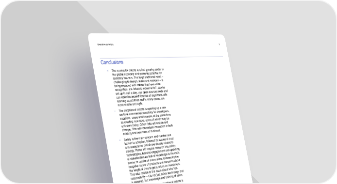 Executive summary 9 Conclusions − The market for cobots is a fast-growing sector in the global economy and presents potential for specialty insurers. The large traditional robot – challenging to design, make and maintain – is being replaced with cobots that have voice recognition, are linked to industrial IoT, can be set up in half a day, use open-sourced code and can optimise around libraries of algorithms with learning capabilities and in many cases, are more mobile and agile. − The adoption of cobots is opening up a new world of commercial possibility for developers, suppliers, users and insurers, at the same time as creating new risks, some of which may be unknown today. Other risks will reduce and change. This will necessitate innovation in both existing and new lines of business. − Safety is the main concern and number one barrier to adoption, followed by issues of trust and acceptance (which are closely related to safety). These will require research into safety technologies, but also engagement and upskilling of stakeholders as lack of knowledge is the main barrier to uptake of automation, followed by the bespoke nature of products and concerns about the length of time to get a return on investment. This also relates to the issue about who has responsibility – it is not just safety technology that is required, but knowledge and training of users. − The report shows how the adoption of cobots is currently constrained by safety, security, liability and physical risks. By helping insureds identify the risks and by setting out ways to mitigate them, insurance could help increase and speed up cobot adoption. − The report suggests robotics designers and manufacturers, systems integrators and users should work with the insurance industry to mitigate and transfer the risks associated with robotics more fully. By leading in this space, the insurance sector will acquire the necessary knowledge to provide insureds with guidance on cobots best practices, thereby shaping the ecosystem in which they operate and the product offering. − To conclude, predicting how rapidly robot and AI technology will be adopted and implemented will occur is difficult, but it is highly likely cobots will play a significant role in transforming many industries, sectors and regions across the world in the next 5 years and beyond. Insurers can facilitate this growth by working with sectors to develop the products and services they need. Taking control: robots and risk