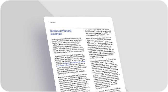 4. Wider impacts 31 Robots and other digital An important concept in integrating these ideas in a technologies virtual environment is that of the “digital twin” (Tao et al, 2018), an idea first introduced by Grieves (2014) when discussing product lifecycle management in 2003.i As cyber-physical systems, robots/cobots are complex A digital twin consists of a physical product, a virtual devices. They require inter-disciplinary collaborations in product and the data that connects the physical and their design, build and execution at many levels. In digital. In the context of Industrie 4.0, a virtual addition to the core skills of sensor development, representation of the factory is created to simulate the programming and AI, coupled with mechanical and physical site. The two are kept in tandem through the electrical engineering, designers also need to consider sharing of captured data from sensors and other the wider ecosystem challenges the robotic entity would mechanisms around the physical factory. A good face, such as integration with other digital technologies. example is ABB’s RobotStudio developed based on its Many developments are currently taking place in the VirtualController, in which an exact copy of the factory Industry Internet of Things (IoT), termed Industrie 4.0 in software enables realistic simulations of the production Europe and the Smart Factory in the USA. These are robots to be tested and evaluated before they are transferred to the shop floor. discussed in further detail in the Lloyd’s Emerging Risk 2018 report Networked world: Risks and opportunities Having cobots in increasingly tightly-coupled industrial in the Internet of Things, but it suffices to say that the systems however, brings its own set of issues. future of manufacturing lies in these cyber-physical Increased data collection in such cyber-physical systems that combine human operators and machines systems, particularly through sensors on cobots, gives such as robots/cobots equipped with sensors, rise to the need for adequate storage space to hold the microprocessors and radio-frequency identification. vast amounts of data being generated. In a potential Other countries such as Japan and Korea have also future where such data is used to optimise flows inside adopted similar smart manufacturing programmes. the factory and supply chains both upstream and When placed within highly-automated plants, these downstream, manufacturers need to mitigate risks of robots/cobots can collect vast amounts of measurement (systemic) failure resulting in large losses in the event of data around processing times, queuing and set up business interruption caused by a cobot breakdown. times and error rates. In turn, data not only helps to Many firms do so by building in redundancy as well as optimise process flows, leading to better asset practicing production strategies such as contingency utilisation and improved quality; it can also inform the and forward planning and stockpiling, as well as design of the next generation of robots/cobots. increasing their use of ‘plug and play’ robots to Crucially, it enables the robot/cobot manufacturer to safeguard against breakdowns. develop alternative business models including through- Also, strong data security is paramount to safeguard life costing and outcome-based contracting. against halts in production streams from potential Recent developments have extended the scope of hacking. Many manufacturers build their own closed cyber-physical downstream to the retailer. The next and networks for their cyber-physical systems, as well as most obvious extension is into the home (Parry et al, practice segregation in restricting the data flow to and 2016), with developments such as the Hub of All Things from the robots. Interviewee #10 stated that many (HAT) offering the potential to optimise supply chains manufacturers have internal networks that are strongly from production to consumption and use. protected from integration to the wider network and therefore their access points are less easily tampered Research at the moment however, tends to focus on with. Interviewee #7 gave examples of automated specific topics and disciplines including sensors; warehouses where there is a firewall between front- communications such as 5G; networking; production office order entry and back-office picking so that only engineering; computer science; data architectures and order information is provided to the robots. ontologies. i Glaessegen and Stargel (2012) define a digital twin as an integrated product and uses the best available physical models, sensor updates, multi-physics, multi-scale, probabilistic simulation of a complex etc., to mirror the life of its corresponding twin. Taking control: robots and risk