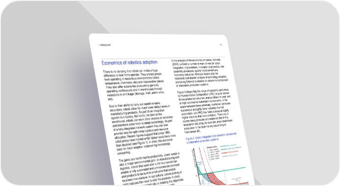 1. Background 14 Economics of robotics adoption In his analysis of the economics of cobots, Schmidt (2018) outlined a number of main drivers for cobot There is no denying that robots can make a huge integration: improvement, innovation ergonomics, new difference to how firms operate. They protect people assembly processes, quality improvement and from operating in hazardous environments (noise, monotony reduction. All these factors alter the temperature, chemicals, etc) and inaccessible places. traditional cost-benefit analysis of technology adoption, They also offer substantial productivity gains by prompting Schmidt to develop an economic comparison operating continuously and in warehouses through of alternative production systems. reductions in shrinkage (damage, theft, admin error, Figure 2 shows that the range of economic usefulness etc). for Human-Robot Collaboration (HRC) is quite narrow. Due to their ability to carry out repetitive tasks At low production volumes, manual labour is used, and accurately, robots allow for much lower defect levels in at high volumes full automation is economic. In the manufacturing products. As part of an integrated space between these extremes, traditional robots are system in a factory, the home, the farm or the economical at slightly lower volumes than full warehouse, robots can warn other devices of variations automation, and HRC has taken a place at slightly and therefore allow them to adapt accordingly. As part higher volumes than manual labour. There are of of a fully-integrated network system they can also course many products and industries that fit this provide data for optimising logistics and resource description including, for example, most small batch allocation. Recent figures suggest that since 1990, production in the food industry (according to robot prices have halved whilst labour costs have more Interviewee #2). than doubled (see Figure 1). In short, the economic Figure 2: Cobot integration and economic comparison case for robot adoption is becoming increasingly of alternative production systems compelling. The gains are not limited to productivity. Lower waste is also a major environmental gain. In manufacturing and logistics, robots that work over a 24-hour period can enable a fully automated and unmanned environment and products to be built in small units that enable localised manufacture. In agriculture, cobots picking at night reduces the need to cool the produce. In short, cobots play an important role in meeting the objectives of the triple bottom line (people, planet, profit). Figure 1: Robot prices have fallen in comparison with labour costs Source: Schmidt, 2018 This model has implications across all four of the sectors included in the report. In industrial, agricultural and retail contexts, the model indicates the economics of replacing labour. It may indeed underestimate the effect by not emphasising the benefits of 24-hour working, the increasingly low costs and sophistication of devices as well as the benefits for process flow and quality control. Indeed, as cobot use increases, production of cobots acquires scale economies, unit Note: Index of average robot prices and labour compensation in costs of sale and installation will decrease, giving rise to manufacturing in United States, 1990=100% further opportunities for their adoption. Source: Tilley, 2017 Taking control: robots and risk