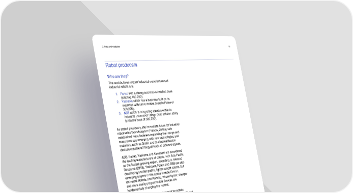 2. Data and statistics 19 Robot producers Who are they? The world’s three largest industrial manufacturers of industrial robots are: 1. Fanuc with a strong automotive installed base (totalling 400,000); 2. Yaskawa which has a business built on its expertise with servo motors (installed base of 360,000); 3. ABB which is integrating robotics within its industrial Internet of Things (IoT) solution ability (installed base of 300,000). As stated previously, the immediate future for industrial robot sales looks buoyant (Francis, 2018a) with established manufacturers expanding their range and many start-ups emerging with new technologies and materials, such as Grabit and its electroadhesion devices capable of lifting all kinds of different objects. ABB, Fanuc, Yaskawa and Kawasaki are considered the leading manufacturers of cobots, with Asia Pacific as the fastest-growing region, according to Inkwood Research (2018). Yaskawa, Fanuc and ABB are also developing smaller profile, lighter-weight cobots, but emerging players in this space include Omron, Universal Robots and Robotiq, whose lighter, cheaper and more easily programmable devices are fundamentally changing the market. We are arguably at an inflection point for cobots (Clements, 2018; Robotics Business Review, 2017) and the sector is moving into a new phase; from being a market with heavy barriers to entry including expensive research and development (R & D) and marketing costs and expensive programming (Market Research Engine, 2017) to one that is rapidly opening with many new suppliers and technologies. The large traditional robot – challenging to design, make and maintain – is being replaced with cobots that have voice recognition, are linked to industrial IoT, can be set up in half a day, use open-sourced code and can optimise around libraries of algorithms with learning capabilities and in many cases, are more mobile and agile (as noted by Interviewee #1). Taking control: robots and risk