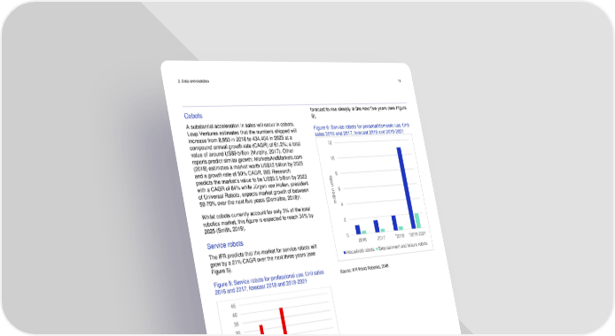 2. Data and statistics 18 Cobots forecast to rise sharply in the next five years (see Figure 6). A substantial acceleration in sales will occur in cobots. Figure 6: Service robots for personal/domestic use. Unit Loup Ventures estimates that the numbers shipped will sales 2016 and 2017, forecast 2018 and 2019-2021 increase from 8,950 in 2016 to 434,404 in 2025 at a compound annual growth rate (CAGR) of 61.2%; a total 12 value of around US$9 billion (Murphy, 2017). Other reports predict similar growth; MarketsAndMarkets.com 10 (2018) estimates a market worth US$12 billion by 2025 and a growth rate of 50% CAGR. BIS Research predicts the market’s value to be US$5.5 billion by 2023 its8 with a CAGR of 64% while Jürgen von Hollen, president un of Universal Robots, expects market growth of between on6 e i 50-70% over the next five years (Demaitre, 2018) . ill Whilst cobots currently account for only 3% of the total m 4 robotics market, this figure is expected to reach 34% by 2025 (Smith, 2018). 2 Service robots 0 The IFR predicts that the market for service robots will 2016 2017 *2018 *2019-2021 grow by a 21% CAGR over the next three years (see Household robots Entertainment and leisure robots Figure 5). Figure 5: Service robots for professional use. Unit sales Source: IFR World Robotics, 2018 2016 and 2017, forecast 2018 and 2019-2021 45 40 35 tsi30 un 25 20 '00015 10 5 0 2016 2017 *2018 *2019-2021 Source: IFR World Robotics, 2018 The IFR also examines robots for personal/domestic use separately, as their unit value is generally only a fraction of many types of service robots for professional use, particularly medical robots (IFR, 2018a). Even so, the use of household and entertainment robots is e The difference in estimates are due to varying baseline figures, economic assumptions and methodologies employed. Taking control: robots and risk