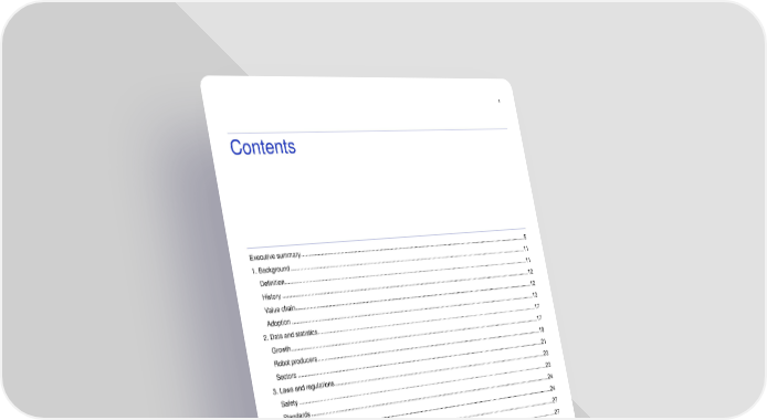4 Contents Executive summary ............................................................................................................................................................... 5 1. Background ..................................................................................................................................................................... 11 Definition .......................................................................................................................................................................... 11 History ............................................................................................................................................................................. 12 Value chain ...................................................................................................................................................................... 12 Adoption .......................................................................................................................................................................... 13 2. Data and statistics ........................................................................................................................................................... 17 Growth ............................................................................................................................................................................. 17 Robot producers .............................................................................................................................................................. 19 Sectors ............................................................................................................................................................................ 21 3. Laws and regulations ...................................................................................................................................................... 23 Safety .............................................................................................................................................................................. 23 Standards ........................................................................................................................................................................ 24 Ethics in robot design ...................................................................................................................................................... 24 4. Wider impacts ................................................................................................................................................................. 27 Perceptions and acceptance ........................................................................................................................................... 27 Societal implications ........................................................................................................................................................ 27 Robot ethics..................................................................................................................................................................... 28 Jobs and skills ................................................................................................................................................................. 29 Robots and other digital technologies ............................................................................................................................. 31 5. A study of four sectors .................................................................................................................................................... 34 Industrial .......................................................................................................................................................................... 34 Agriculture ....................................................................................................................................................................... 37 Healthcare ....................................................................................................................................................................... 39 Retail ............................................................................................................................................................................... 42 6. Conclusions .................................................................................................................................................................... 45 References .......................................................................................................................................................................... 46 Appendix A: Glossary of terms - Robots ............................................................................................................................. 52 Appendix B: Safety standards ............................................................................................................................................ 53 Taking control: robots and risk