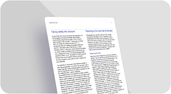 Executive summary 6 Taking safety into account Reacting to the new risk landscape A total of 38 robot-related accidents was reported to the Widespread cobot use will create new risks, change US Occupational Safety and Health Administration existing risks and reduce others. To develop a more (United States Department of Labor, 2019) in the 33 compelling picture of the cobots landscape, the report years between 1984 and 2017. Twenty-seven of those looks at four sectors (industrial environments, agriculture, led to the death of a worker (Nichols, 2017). In healthcare and retail) in which the use of cobots is comparison, the total number of workplace fatalities in currently constrained by concerns about the risks the US in 2013 alone was 4,585 (Bureau of Labor highlighted below. By helping insureds identify the risks Statistics, 2015). In Germany, severe industrial accidents and by offering ways to mitigate them, insurance could (i.e. those resulting in fatality or loss of limbs) are very help increase and speed up cobot adoption. rare, ranging from three to 15 annually between 2005 and 2012 (DGUV, 2015). Murashov et al (2016) pointed Reducing the risks out that there are few reports detailing accidents Robots can make a huge difference to how companies involving industrial robots, and that such incidents are operate. They can prevent people from having to work in rare worldwide. hazardous environments and inaccessible places. They The reliability of robots and cobots depends greatly on increase productivity because they can operate their design application and where they are used. Use of continuously and reduce human errors in warehouses. cobots typically involves multiple parties that include not The use of robotics in surgery has been found to shorten just the organisation where the cobot is installed, but also lengths of hospital stay, decrease complication rates and its installation team, systems integrator, allow surgeons to perform finer tasks. Robotics in consultants/advisors and maintenance team, possibly agriculture could potentially reduce environmental telecommunications and cloud service providers as well impact. Robotic devices executing precision tasks and operating either alone or in clusters can be less as the cobot’s designer and manufacturer. While most damaging than combine harvesters with their significant cobots are not necessarily considered dangerous, given weight and load-bearing footprint. The gains are not their relatively low payload, it is nonetheless important limited to productivity. Lower waste is also a major that firms ensure there is oversight from a health and environmental gain. In manufacturing and logistics, safety human expert and that their cobots operate in robots that work over a 24-hour period can enable fully compliance with international standards for robot safety automated environment with no human presence on-site standards. The design, manufacture and operation of and products to be built in small units that enable robots and cobots fall within the scope of several layers localised manufacture. In agriculture, cobots picking at of ISO Standards and Technical Specifications. night reduces the need to cool the produce. In short, Even though cobots are not necessarily considered cobots play an important role in meeting the objectives of dangerous, one of the challenges for the insurance the triple bottom line (people, planet, profit). industry is that “there are simply not enough cobots in the The report finds: market to get accident statistics” as stated by Interviewee #1 (see page 23). Given the low numbers of robot-related − The widespread adoption of autonomous mobile accidents and the fact that only around 3% of installed robots in retail and agriculture is likely to reduce robots were cobots in 2015, it is not surprising the data on cobot-specific accidents is not yet available. employees’ accidents and failures caused by fatigue. A dedicated risk assessment will be crucial, as are − The use of robots in dangerous environments, additional measures to reduce risk based on real-world such as nuclear decommissioning, mining, space performance data (Platbrood & Görnemann, 2018). and construction, can help improve safety. − For insurers, increasing adoption of robots in dangerous environments would reduce number of employee injury claims by automating processes. Taking control: robots and risk