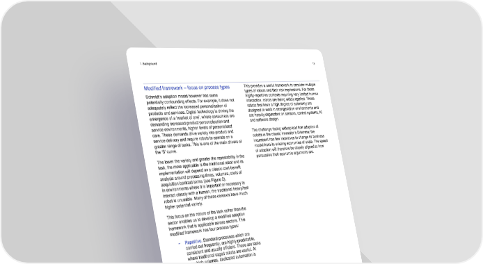 1. Background 15 Modified framework – focus on process types This provides a useful framework to consider multiple Schmidt’s adoption model however has some types of robots and their risk implications. For those potentially confounding effects. For example, it does not highly-repetitive contexts requiring very limited human adequately reflect the increased personalisation of interaction, robots are being widely applied. Those robots that have a high degree of autonomy are products and services. Digital technology is driving the designed to work in stranger/alien environments and emergence of a ‘market of one’, where consumers are are heavily dependent on sensors, control systems, AI demanding increased product personalisation and and software design. service environments, higher levels of personalised care. These demands drive variety into product and The challenge facing widespread firm adoption of service delivery and require robots to operate on a cobots is the classic Innovator’s Dilemma; the greater range of tasks. This is one of the main drivers of incumbent has few incentives to change its business the ‘S’ curve. model from its existing economies of scale. The speed of adoption will therefore be closely aligned to how The lower the variety and greater the repeatability in the persuasive their economic arguments are. task, the more applicable is the traditional robot and its implementation will depend on a classic cost-benefit analysis around processing times, volumes, costs of acquisition/contract terms (see Figure 2). In environments where it is important or necessary to interact closely with a human, the traditional heavy/fast robot is unusable. Many of these contexts have much higher potential variety. This focus on the nature of the task rather than the sector enables us to develop a modified adoption framework that is applicable across sectors. This modified framework has four process types: − Repetitive. Standard processes which are carried out frequently, are highly predictable, consistent and usually efficient. These are tasks where traditional caged robots are useful. At very high volumes, dedicated automation is used. − Repeaters. Processes which are still predictable but less frequent in occurrence. The type of robot applied will depend on the cost- benefit analysis. − Strangers. Processes which are highly customised, rarely occurring and often requiring a high level of specialised resource. These are likely to be environments where cobots are used if the variety does not overwhelm the analytic capability (e.g. in vision systems). − Aliens. Things that have not been seen before and will therefore be outside the robot/cobot’s area of expertise. Robots/cobots are unlikely to be used in these contexts until much more sophisticated data analytics and learning have been developed. Taking control: robots and risk