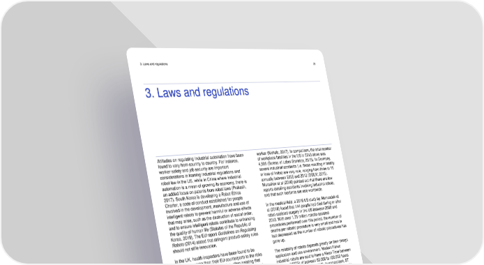 3. Laws and regulations 23 3. Laws and regulations Attitudes on regulating industrial automation have been worker (Nichols, 2017). In comparison, the total number found to vary from country to country. For instance, of workplace fatalities in the US in 2013 alone was worker safety and job security are important 4,585 (Bureau of Labor Statistics, 2015). In Germany, considerations in framing industrial regulations and severe industrial accidents (i.e. those resulting in fatality robot law in the US, while in China where industrial or loss of limbs) are very rare, ranging from three to 15 automation is a mean of growing its economy, there is annually between 2005 and 2012 (DGUV, 2015). an added focus on patents from robot laws (Prakash, Murashov et al (2016) pointed out that there are few 2017). South Korea is developing a Robot Ethics reports detailing accidents involving industrial robots, Charter, a code of conduct established for people and that such incidents are rare worldwide. involved in the development, manufacture and use of In the medical field, a 2016 US study by Alemzadeh et intelligent robots to prevent harmful or adverse effects al (2016) found that 144 people had died during or after that may arise, such as the destruction of social order, robot-assisted surgery in the US between 2000 and and to ensure intelligent robots contribute to enhancing 2013. With over 1.75 million robotic-assisted the quality of human life (Statutes of the Republic of procedures performed over this period, the number of Korea, 2019). The EU report Guidelines on Regulating deaths per robotic procedure is very small and has in Robots (2014) stated that stringent product-safety rules fact decreased as the number of robotic procedures has should not stifle innovation. gone up. In the UK, health inspectors have been found to be The reliability of robots depends greatly on their design more risk averse than their EU counterparts to the risks application and use environment. Modern Fanuc of installing cobots in UK factories, often insisting that industrial robots are said to have a Mean Time between all robots should be fully guarded (Interviewees #7 and Failures (MBTF) of between 80,000 to 100,000 hours #9). The Health and Safety Executive (HSE) magazine (Motion Controls Robotics, 2019). In comparison, ST cites a number of people who have gone through the Robotics (2018) quotes a MTBF of 15,000 hours for its process of putting a cobot into their factory and then R12 cobot arm in a workshop situation. A 2004 being told by a health and safety inspector: ‘That’s not reliability analysis of mobile robots in a hostile safe, stop.’ (Warburton, 2017). When the appropriate environment found an average MTBF of 24 hours, an regulations have been followed at all stages of design improvement from the eight hours reported in 2002 and implementation, with robust mitigation procedures (Carlson et al, 2004). Mobile robots are lighter-built, with and training in place, then it can be shown that the less mechanical redundancy than static industrial cobot will probably not be considered ‘dangerous’ robots, which means they have lower reliability. The (Warburton, 2017). mobile robots tested were however not operating in Safety optimised conditions in a factory with low-variety tasks and loads. Instead, they were simulating military operations in urban terrain and urban search-and- In 2015, a technician died in an accident with a robot at rescue operations, hence in varied and hostile a Volkswagen plant in Germany, sparking a flurry of environments, and with a high variety of loadings. discussion about robot safety (Financial Times, 2015). Given the low numbers of robot-related accidents and A total of 38 robot-related accidents was reported to the the fact that only around 3% of the installed robot base US Occupational Safety and Health Administration were cobots in 2015, it is hardly surprising that data on (United States Department of Labor, 2019) in the 33 cobot-specific accidents is not yet available. As years between 1984 – when the first human was killed Interviewee #1 stated: “There are simply not enough by a robot at Ford’s Flat Rock plant in Michigan – and cobots in the market to get accident statistics”. 2017. Twenty-seven of those led to the death of a Taking control: robots and risk
