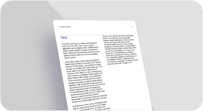5. A study of four sectors 42 Retail However, some customers will still prefer personalised attention, and abilities such as accurate problem diagnosis, emotion identification and picking up social The overall retail market for cobots is estimated to be cues are notoriously very difficult to automate. worth more than US$11 billion across a range of Interviewee #4 told us that a lot of work is currently applications such as shopping malls, receptionists and taking place in identifying emotion. At Carnegie Mellon guides in hotels, airports, museums and amusement University’s Robotics Institute, its director Martial Hebert parks. Cobots also have significant potential to provide has said that the challenges are not so much in the guidance in banks and to carry out simple repetitive robotics but in “Understanding people, predicting cashier functions. people, and understanding their intentions. Everything Cobots mainly used in warehouses are Autonomous from understanding pedestrians for self-driving cars, to Mobile Robots (AMRs). For example, in 2017 Amazon understanding co-workers in collaborative robot had over 100,000 robots in use worldwide, with plans manufacturing, any application that involves interaction for many more (Heater, 2017) whilst Ocado has 1,100 with people at any level.” (Anandan, 2018). in one single 18-acre facility in South East UK (Kleinman, 2018). Robots are also increasingly being used not just to move products across a space but to deliver directly to the customer, such as Best Buy’s Chloe which picks up the CDs and DVDs ordered through touchscreens and delivers to the customer. Best Buy’s ‘Tally’ robot travels through warehouse aisles and tally up stock and can work out if items had been wrongly priced or put in the wrong place. The Starship delivery robot can travel outside the warehouse on pavements at around 4 miles an hour and carry a load of around 9kg. However, Interviewee#1 pointed out that these might need to be limited to very flat landscapes within low-crime zones. In South Korea, E-Mart is using LG’s shopping carts that can follow the customer around and navigate shopping aisles (Synek, 2018). One of the future benefits of the electronic cart is the ability to scan items as they are put into the cart and therefore reducing the need for check-out assistants. Giant Food Stores are using a cobot (Bowles, 2019) called Marty that alerts customers around it when it sees something it considers a hazard. It then sends a message to humans (located, in this case, in the Philippines) who are monitoring the stores on TV screens to determine if the potential hazard is something about which they need to alert the store manager. Investment in such a cobot is economically viable because US slip-and-fall accidents can be expensive if the retailer is found to be at fault. Cobots also have the potential to transform the customer experience. A recent survey (Ismail, 2017) found that nearly half of British consumers have experienced bias because of their individual characteristics, beliefs and/or appearance. Only 8% of respondents felt that chatbots will be biased; this is despite concerns that human bias could be transferred onto modern chatbots. Taking control: robots and risk