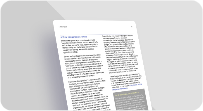 4. Wider impacts 32 Artificial intelligence and robotics Potential cyber-risks, including hacking and data theft Artificial Intelligence (AI) is a core technology in the from systems as well as when devices are future development of robotics. Much of research in AI, communicating give rise to concerns about malicious such as deep learning for vision, speech recognition in tampering. There are concerns that processes could be interface design and the transition from supervised to changed, or a systematic defect could be introduced, unsupervised learning, are central to the future while factories and workspaces could be held at application of cobots. ransom; for instance with threats to shut down robots on a farm during peak picking seasons and hence Several leading robot and cobot experts we interviewed allowing crops to rot. There is also the potential for revealed important recent developments in AI research. deliberate unethical training of a cobot, although it Interviewee #9 identified significant developments would be the responsibility of the robot installer/systems taking place in sensing for safety, for example, where a integrator to minimise the likelihood of this occurring. knife is used on the end of a robot arm. Interviewee #2 The experts we spoke to say such incidents of using pointed out how important vision systems and predictive robots to cause damage are rare, but that the greater analysis are for ensuring worker safety where heavy risk lies in the theft of the IP and ideas by disgruntled loads are being moved around a farm or retail site, employees, particularly when they have a good while Interviewee #5 noted the challenges in developing understanding of how the systems function and how AI for interpreting images on a conveyor. different components such as the sensors work. Interviewee #8 emphasised the importance of AI for Future developments in robotics are closely linked to developing improved interface design, crucial for robotic those in AI. Indeed, all our interviewees highlighted that use in all locations but particularly in the home. the future of robotics is really constrained by the future Interviewee #8, who conducts research on of AI. The developments in AI and their potential conversational interfaces, highlighted the challenges impacts on the insurance industry are discussed in around designing an interface to minimise safety further detail in Lloyd’s report Taking control: artificial concerns where speech may be misheard or intelligence and insurance. misunderstood and could lead to potentially life- threatening situations. A second problem is making the Box 4: Developing conversational AI interface engaging and entertaining so that people will The risk with conversational AI is the potential for continue to interact with the device. Interviewee #8 systems to misunderstand the user (either through emphasised that “we are nowhere near a humanoid poor speech recognition, environmental noise, or robot” and “it is still science fiction”. Finally, although we language understanding), thus likely leading to an might be able to instruct a robot to stack a dishwasher unintended action (wrong health information or do the ironing, it would do so very slowly and only for delivered, unintended purchase, driver distraction). that specific home. It would also very unlikely be able to These factors can be somewhat mitigated by good perform any other domestic chores. conversational AI design, for example, explicitly Interviewee #10 discussed future cobots in confirming user requests at crucial moments. This unsupervised learning within a factory or home, is currently the subject of much ongoing research. highlighting the issue as to who owns any new In 2017, Amazon launched the annual Alexa Prize, Intellectual Property (IP) that is developed: the firm, the inviting teams of university students to develop a owner, the systems integrator or even the robot itself? chatbot capable of conversing with humans on a As far-fetched as it may sound, it does raise the wider variety of subjects. Building on existing Amazon issue of AI-enabled cobots becoming independent Alexa software, the teams would create a socialbot, actors. Interviewee #10 also foresees security and advancing knowledge acquisition, natural language privacy concerns for firms whose IP lies in understanding, natural language generation, manufacturing. Having a device that can understand context modelling, common sense reasoning and how their entire factory/supply chain works and dialogue planning. analysing that data remotely might limit its adoption. The tech giant believes the way humans interact with machines is at an inflection point, and that conversational AI is at the centre of the transformation (Amazon, 2018). Hence it is investing substantially in the prize which it hopes will help advance the field. Taking control: robots and risk