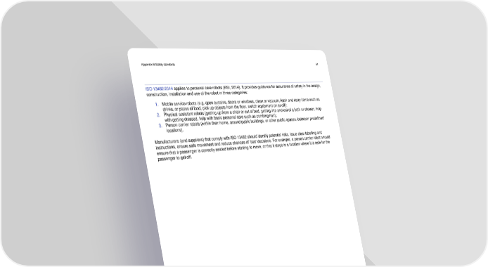 Appendix B:Safety standards 54 ISO 13482:2014 applies to personal care robots (BSI, 2014). It provides guidance for assurance of safety in the design, construction, installation and use of the robot in three categories: 1. Mobile service robots (e.g. open curtains, doors or windows, clean or vacuum, fetch and carry items such as drinks, or plates of food, pick up objects from the floor, switch equipment on or off); 2. Physical assistant robots (getting up from a chair or out of bed, getting into and out of a bath or shower, help with getting dressed, help with basic personal care such as combing hair); 3. Person carrier robots (within their home, around public buildings, or other public spaces, between predefined locations). Manufacturers (and suppliers) that comply with ISO 13482 should identify potential risks, issue clear labelling and instructions, ensure safe movement and reduce chances of ‘bad’ decisions. For example, a person carrier robot should ensure that a passenger is correctly seated before starting to move, or that it stops in a location where it is safe for the passenger to get off. Taking control: robots and risk