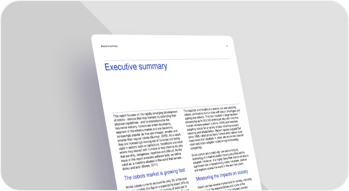Executive summary 5 Executive summary This report focuses on the rapidly emerging development The logistics and healthcare sectors are also adopting of cobots - devices that help humans by extending their cobots, particularly in countries with labour shortages and physical capabilities - and its implications for the ageing populations. This has resulted in large facilities insurance industry. Cobots are a fast-developing processing up to 200,000 orders per day with only four segment of the robotics market and are becoming human workers present (LeVine, 2018) and hospitals increasingly popular as they are cheaper, smaller and adopting robots for a variety of jobs including surgery, smarter than regular robots (Gurman, 2018). As a result, cleaning and rehabilitation. Recent figures suggest that they are increasingly moving out of factories and being since 1990, robot prices have halved whilst labour costs used in sectors such as agriculture, healthcare and retail have more than doubled. In short, the economic case for where they interact with humans or help them to do jobs robot and cobot adoption is becoming increasingly that are dirty, dangerous, repetitive and difficult. As the compelling. focus of this report excludes software bots, we define Since cobots are a relatively new and emerging robot as ‘a machine situated in the world that senses, technology it is hard to predict how quickly they will be thinks and acts’ (Bekey, 2011). adopted. However, it is highly likely that cobots will play a The cobots market is growing fast significant role in transforming many industries, sectors and regions across the world in the next few years. Whilst cobots currently account for only 3% of the total Measuring the impacts on society robotics market, this figure is expected to reach 34% by 2025 (Smith, 2018) with the total value of sales set to Robot use has several implications for society, including reach US$9-12 billion by then (Murphy, 2017). The top determining the responsibilities and rights of the cobot exporters include Japan, Germany, Italy and machines, and where liability lies between owners, France (Trade Map, 2018), while 75% of imports are designers, programmers and other collaborators. made by China, the Republic of Korea, Japan, the United Introducing cobots into a public environment is much States and Germany (IFR, 2018c). more than a technological challenge. Possibly the biggest At the moment, manufacturing remains the principal limit on the use of cobots is their compatibility with health market for cobots. However, there are also clear and safety regulations and public attitudes, although emerging markets for industrial cobots (CB Insights, recent research points to increasing acceptance as 2018) in new set of industries (IFR, 2018b) where jobs people become more accustomed to seeing robots in are: use. − Dirty (e.g. construction and demolition: 1,100 While there is consensus that robots are already units sold in 2018); displacing jobs and will continue to do so, robots, − Dangerous (e.g. defence: 12,000 units bought in particularly cobots, rarely replace workers; they replace 2017); tasks. They often help workers through decision-making, or physical handling rather than replacing them. − Difficult (e.g. surgery: US$1.9 million worth sold However, as with any other tool, on aggregate robots will in 2018); and impact employment. − Repetitive (e.g. farming: 7,200 units sold in The shift towards automation will also create new jobs, 2018). as predicted by PwC’s 2018 UK Economic Outlook. Taking control: robots and risk