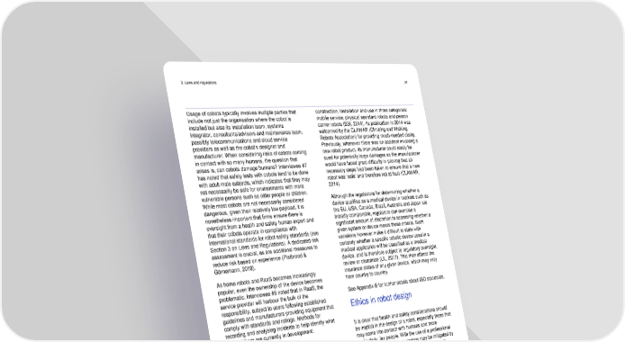 3. Laws and regulations 24 Usage of cobots typically involves multiple parties that construction, installation and use in three categories: include not just the organisation where the cobot is mobile service, physical assistant robots and person installed but also its installation team, systems carrier robots (BSI, 2014). Its publication in 2014 was integrator, consultants/advisors and maintenance team, welcomed by the CLAWAR (Climbing and Walking possibly telecommunications and cloud service Robots Association) for providing much-needed clarity. providers as well as the cobot’s designer and Previously, whenever there was an accident involving a manufacturer. When considering risks of cobots coming new robot product, its manufacturer could easily be in contact with so many humans, the question that sued for potentially large damages as the manufacturer arises is, can cobots damage humans? Interviewee #7 would have faced great difficulty in proving that all has noted that safety tests with cobots tend to be done necessary steps had been taken to ensure that a new with adult male subjects, which indicates that they may robot was ‘safe’ and therefore not at fault (CLAWAR, not necessarily be safe for environments with more 2014). vulnerable persons such as older people or children. Although the regulations for determining whether a While most cobots are not necessarily considered device qualifies as a medical device in markets such as dangerous, given their relatively low payload, it is the EU, USA, Canada, Brazil, Australia and Japan are nonetheless important that firms ensure there is broadly comparable, regulators can exercise a oversight from a health and safety human expert and significant amount of discretion in assessing whether a that their cobots operate in compliance with given system or device meets those criteria. Such international standards for robot safety standards (see variations however make it difficult to state with Section 3 on Laws and Regulations). A dedicated risk certainty whether a specific robotic device used in a assessment is crucial, as are additional measures to medical application will be classified as a medical reduce risk based on experience (Platbrood & device, and is therefore subject to regulatory oversight, Görnemann, 2018). review or clearance (UL, 2017). This then affects the As home robots and RaaS becomes increasingly insurance status of any given device, which may vary popular, even the ownership of the device becomes from country to country. problematic. Interviewee #9 noted that in RaaS, the See Appendix B for further details about ISO standards. service provider will harbour the bulk of the responsibility, subject to users following established guidelines and manufacturers providing equipment that Ethics in robot design comply with standards and ratings. Methods for recording and analysing incidents to help identify what It is clear that health and safety considerations should caused them are currently in development. be implicit in the design of a robot, especially those that Standards may come into contact with humans and more particularly, lay people. With the use of a professional service robot, some shortcomings may be mitigated by The design, manufacture and operation of robots and its operator receiving adequate training. However, cobots fall within the scope of several layers of ISO where the operator is a lay person physically interacting Standards and Technical Specifications. Cooperative with a personal service robot, safety is a major and robots are specifically addressed in ISO 10218-1:2011, primary concern (Röhrbein et al, 2013), as ‘naïve users’ which provides for four modes of safe working. do not have a good understanding of how a robot moves (Rodrigues et al, 2016). Published in 2016, ISO/TS 15066 only applies to cobots in industrial environments, although its principles are The Engineering and Physical Sciences Research relevant in other sectors. This Technical Specification Council pointed out that Asimov’s laws of robotics are aims to provide a comprehensive risk assessment guide inappropriate because they insist that robots behave in of all the motions, interactions and operations a robot certain ways, as if they are people (EPSRC, 2010). In should perform in environments where humans are real life however, it is the people who design and use present. For instance, its pressure and force limit the robots who must be the actual subjects of any law. specifications can help prevent injury if there is incidental contact between a human worker and a robot Hence, the Council has developed five “rules” for the (Robotiq, 2018). For example, in the case of a designers, builders and users of robots: packaging application where a robot’s points of human 1. Restricting the design of robots as weapons contact are already limited to workers occasionally only for national security purposes; supplying one bin and occasionally removing the other. 2. Robot design and operation should conform to Personal care robots are governed by the ISO existing law, including privacy; 13482:2014, which provides guidance on safe design, 3. Robots should be designed to be safe and secure; Taking control: robots and risk