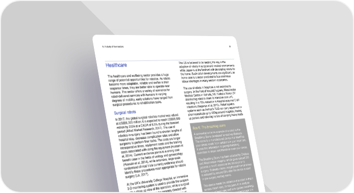 5. A study of four sectors 39 Healthcare The US is believed to be leading the way in the adoption of robots in surgical and medical environments while Japan is at the forefront with developing robots for The healthcare and wellbeing sector provides a huge the home. Such cobot developments are significant, as range of potential opportunities for robotics. As robots home care is a sector predicted to face enormous become more adaptable, reliable and swifter in their labour shortages in many western economies. response times, they are better able to operate near The use of robots in hospitals is not restricted to humans. The sector offers a variety of scenarios for surgery. In the field of hospital hygiene, Westchester robot-delivered services with humans in varying Medical Centre in Valhalla, NY, trialled a Xenex UV degrees of mobility; early solutions have ranged from disinfecting robot to clean its intensive care unit, surgical procedures to rehabilitation tasks. resulting in a 70% reduction in hospital-acquired C diff Surgical robots infections (Nagaraja et al, 2015). Robot logistics In 2017, the global surgical robotics market was valued systems such as Aethon’s TUG can carry equipment or at US$56,300 million; it is expected to reach US$99,000 pharmaceuticals up to 400kg around hospitals, freeing million by 2024 at a CAGR of 8.5% during the forecast up porters and relieving nurses of carrying heavy loads. period (Allied Market Research, 2017). The use of Box 6: The breathing stone robotics in surgery has been found to shorten lengths of hospital stay, decrease complication rates and allow A somewhat extreme example of a cobot is the surgeons to perform finer tasks. The costs are longer Breathing Stone developed by start-up Biobeats. intraoperative times, equipment costs and the training The stone is a manufactured device that identifies costs associated with using the equipment (Hussain et your stress levels from variations in your heart rate. al, 2014). Current evidence points to a strong cost- It uses this information to prompt breathing benefit case in the fields of urology and gynaecology exercises to music and therefore lower your stress. (Hussain et al, 2014), while extensive, large-scale randomised clinical trials currently underway should The Breathing Stone has been adopted by Chelsea identify those procedures most appropriate for robotic and Westminster Hospital, which gives around 200 surgery (Lai, 2017). patients a month access to the device prior to At the UK’s University College Hospital, an immersive surgery. Biobeats claims that physical/mental stress 3-D monitoring system is used to provide the surgeon is reduced by around 23% after the device is used with a close-up view of the operation, while a surgical in pre-surgery waiting rooms. robot with four arms can be remotely directed with This device meets the definition of a cobot in that it considerable dexterity, resulting in reduced risk of senses (heart rate), thinks (uses AI to analyse complications as well as training benefits for others patterns of heart rate) and acts (guides breathing). observing the recorded procedure (Adams, 2018). More impressively, in 2017 it was reported that a robot dentist Although it doesn’t meet the standard image of a fixed industrial cobot, it provides an example of how in China was able to carry out the world’s first technology is adapting to meet patient needs and successful autonomous implant surgery by fitting two providing innovative applications of AI. new teeth into a woman’s mouth without any human intervention (Yan, 2017). As surgical systems continue to evolve with new technologies, uniform standards for surgical team training, advanced human machine interfaces, improved accident investigation and reporting mechanisms, and safety-based design techniques should be developed to reduce incident rates in the future. While robotic surgical systems have been successfully adopted in many different specialties, a study by Alemzadeh et al (2013) has found that while the overall numbers of injury and death events have stayed relatively constant over the years as the number of procedures has increased, device and instrument malfunctions have affected thousands of patients and surgical teams by causing complications and prolonged procedure times. Taking control: robots and risk