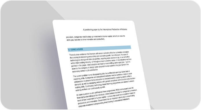 A positioning paper by the International Federation of Robotics providers, companies need to step up investment in human capital, not only to close the skills gap, but also to drive innovation and productivity. 5. CONCLUSION There is clear evidence that humans will remain central to effective automation strategies that are key to improving productivity and economic growth. As in the past, this wave of technological change will alter job profiles, requiring some workers to up- or re-skill either within their existing industry, or through a move to another sector. In the industries we have profiled in this paper, robot adoption can lead to more fulfilling, better-paid jobs – but it is down to the company to design cyber-physical-human-systems that give humans the autonomy central to job satisfaction. The current problem is not disappearing jobs, but unfilled job openings due to lack of matching skills. Companies and educational institutes need to continue a trend of closer collaboration to ensure formal education is directed towards supplying specific skills in demand, as well as equipping workers with general analytical, communication and decision- making skills. Continuous, technology-based learning programmes are needed to ensure existing workers can continuously up-skill. An open question is who will finance these programmes. Whilst some experts see the financial burden falling to the individual, others believe it is time for companies to reverse a trend of low investment in human capital – a move that could have a positive impact on productivity and innovation. Government has an important role to play in incentivising corporate investment and providing direct funding to educational institutions. 27 Positioning Paper March 2018