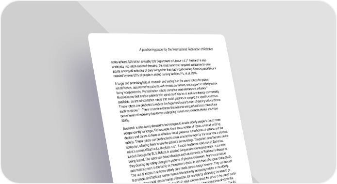 A positioning paper by the International Federation of Robotics costs at least $20 billion annually (US Department of Labour n.d.)15 Research is also underway into robot-assisted dressing, the most commonly required assistance for older adults among all activities of daily living other than bathing/showering. Dressing assistance is needed by over 80% of people in skilled nursing facilities (Yu, et al. 2016). A large and promising field of research and testing is in the use of robots for patient rehabilitation, assistance for patients with chronic conditions, and support for elderly people living independently. Rehabilitation robots comprise exoskeletons and orthotics16. Exoskeletons that enable patients with spinal cord injuries to walk are already commercially available, as are rehabilitation robots that assist patients in carrying out specific exercises. These robots are predicted to reduce the huge healthcare burden of dealing with conditions such as stroke17 . There is some evidence that patients using rehabilitation robots have better levels of recovery than those undergoing human-only methods (Krebs and Volpe 2015). Research is also being devoted to technologies to enable elderly people to live at home independently for longer. For example, there are a number of robots aimed at enabling doctors and carers to have an effective virtual presence in the homes of patients and the elderly. These robots can be directed to move around the room by the carer from a standard computer, allowing them to see the patient’s surroundings. The patient sees the carer on the robot’s screen (Giraff n.d.), (Anybots n.d.). A social healthcare robot named Zacharias, funded through the EU’s Robots in assisted living environments programme, is currently being tested. The robot can detect diseases such as dementia or Parkinson’s disease as they develop by noting changes in patterns of physical movement. Any unusual data is automatically sent to the family or the person’s doctor to alert them (European Union 2017). The use of robots in at-home elderly care needs careful design however. They can be used to promote and facilitate human-human interaction by increasing mobility in the elderly. Equally, they could reduce human interaction, for example by eliminating the need to go shopping. Some academics (Turkle 2012) raise concern about the ethics of the use of social robots with the elderly, who may be open to manipulation. User acceptance of robots that assist humans in highly personal tasks also requires sophisticated robot interfaces. The EU and Japan are funding a £2m project to develop versatile, ‘culturally-aware’ robots that are re-configurable to match national culture and customs to help look after older people in care homes or sheltered accommodation (BBC 2017). 15 A study in the Netherlands found that lifting weights of 25 kg increases lower back injuries by 3.7 per 100 employees per year (Gezondheidsraad 2012). 16 Passive or powered external devices for the neck, upper limb, trunk, and lower limb that are designed to guide motion, bear weight, align body structures, protect joints, or correct deformities. 17 In the U.S. alone, there are 795 000 patients with new strokes every year with over 6 million survivors (Krebs and Volpe 2015). Performing many repetitive exercises is an effective way of getting the brain to learn to control muscle groups paralysed as a result of stroke – something that robots can be programmed to do (What is Patient at Home). 15 Positioning Paper March 2018