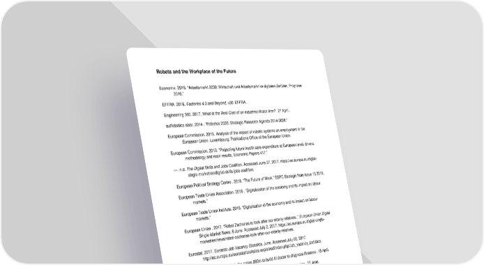 Robots and the Workplace of the Future Economix. 2016. “Arbeitsmarkt 2030: Wirtschaft und Arbeitsmarkt im digitalen Zeitlater, Prognose 2016.” EFFRA. 2016. Factories 4.0 and Beyond, v30. EFFRA. Engineering 360. 2017. What Is the Real Cost of an Industrial Robot Arm? . 27 April . euRobotics aisbl. 2014 . “Robotics 2020: Strategic Research Agenda 2014-2020.” European Commission. 2015. Analysis of the impact of robotic systems on employment in the European Union. Luxembourg: Publications Office of the European Union. European Commission. 2010. “Projecting future health care expenditure at European level: drivers, methodology and main results, Economic Papers 417.” —. n.d. The Digital Skills and Jobs Coalition. Accessed June 27, 2017. https://ec.europa.eu/digital- single-market/en/digital-skills-jobs-coalition. European Political Strategy Centre . 2016. “The Future of Work.” ESPC Strategic Note Issue 13 2016,. European Trade Union Association. 2016 . “Digitalisation of the economy and its impact on labour markets.” European Trade Union Institute. 2016. “Digitalisation of the economy and its impact on labour markets.” European Union . 2017. “Robot Zacharias to look after our elderly relatives,.” European Union Digital Single Market News. 6 June. Accessed July 2, 2017. https://ec.europa.eu/digital-single- market/en/news/robot-zacharias-look-after-our-elderly-relatives. Eurostat. 2017. Eurostat Job Vacancy Statistics. June. Accessed July 02, 2017. http://ec.europa.eu/eurostat/statistics-explained/index.php/Job_vacancy_statistics. Financial Times. 2017 . Babylon raises $60m to build AI doctor to diagnose illnesses . 15 April. Financial Times. 2017. Cancer treatment: scaling up a vein-to-vein solution . 12 June. —. 2017. “Artificial intelligence closes in on the work of junior lawyers .” Financial Times, 4 May. Financial Times. 2017. The internet of things: industry’s digital revolution, . 27 June. Fortune. 2016. Nurses Are Again in Demand. 7 November. Fraunhofer IGCV. 2017. Teaching smart production: Concept of the learning factory for cyber-physical production systems. Fraunhofer IGCV. Fraunhofer IPA. 2016. “Drag & Bot.” Fraunhofer IPA. June. Accessed August 10, 2017. https://www.ipa.fraunhofer.de/content/dam/ipa/de/documents/Kompetenzen/Roboter--und- Assistenzsysteme/Produktblatt_Drag_Bot_Roboterprogramme.pdf. Freeman, Richard. 2015. Who Owns the Robots Rules the World. IZA World of Labor. Frey, Carl Benedikt, and Michael Osborne. 2013. The Future of Employment: How Susceptible are Jobs to Computerisation. Working Paper, Oxford Martin School. Gezondheidsraad. 2012. Manual Lifting During Work. 20 December. https://www.gezondheidsraad.nl/sites/default/files/2136E_Manual_Lifting_during_work.pdf. Giraff. n.d. Giraff. Accessed July 2, 2017. http://www.giraff.org/. March 2018 Positioning Paper 30