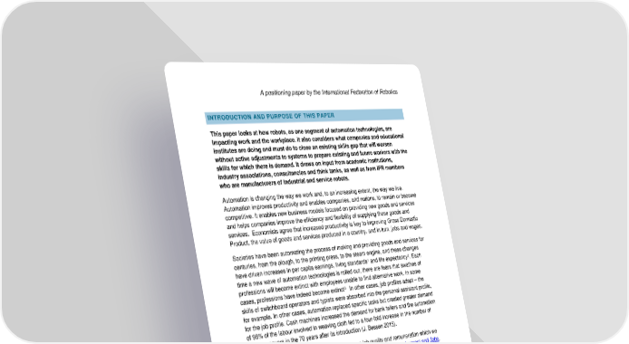 A positioning paper by the International Federation of Robotics INTRODUCTION AND PURPOSE OF THIS PAPER This paper looks at how robots, as one segment of automation technologies, are impacting work and the workplace. It also considers what companies and educational institutes are doing and must do to close an existing skills gap that will worsen without active adjustments to systems to prepare existing and future workers with the skills for which there is demand. It draws on input from academic institutions, industry associations, consultancies and think tanks, as well as from IFR members who are manufacturers of industrial and service robots. Automation is changing the way we work and, to an increasing extent, the way we live. Automation improves productivity and enables companies, and nations, to remain or become competitive. It enables new business models focused on providing new goods and services and helps companies improve the efficiency and flexibility of supplying those goods and services. Economists agree that increased productivity is key to improving Gross Domestic Product, the value of goods and services produced in a country, and in turn, jobs and wages. Societies have been automating the process of making and providing goods and services for centuries, from the plough, to the printing press, to the steam engine, and these changes have driven increases in per capita earnings, living standards1 2 and life expectancy . Each time a new wave of automation technologies is rolled out, there are fears that swathes of professions will become extinct with employees unable to find alternative work. In some . cases, professions have indeed become extinct3 In other cases, job profiles adapt – the skills of switchboard operators and typists were absorbed into the personal assistant profile, for example. In other cases, automation replaced specific tasks but created greater demand for the job profile. Cash machines increased the demand for bank tellers and the automation of 98% of the labour involved in weaving cloth led to a four-fold increase in the number of factory weavers in the 70 years after its introduction (J. Bessen 2015). Automation has a long history of positive impact on job quality and remuneration which we discuss in depth in our paper The Impact of Robots on Productivity, Employment and Jobs. There is no historical evidence of technology being detrimental to aggregate employment levels. Yet each wave of technological change brings with it the fear of whether this time will be different. Will automation destroy more jobs than it creates? These fears are evident in the current discourse in many Western economies on automation and robots. This time, fears focus not only on job replacement but on the possibility of super-intelligent robots out- smarting or even controlling humans. It is notable that public attitudes to robots and automation differ between countries – not only between developed and developing economies, but also within developed economies. Developed economies such as Japan and China have a generally positive public discourse on robots. Some of this is cultural – for example, the positive attitude to robots in Japan is often explained by the cultural heritage of animism which accords non-human objects a 1 For example, the average hourly compensation of American employees increased by 85 percent between 1973 and 2014 (Heritage Foundation 2015). 2 Average life expectancy has gone from 50 years for babies born in 1900 to over 80 in many countries (National Institute on Aging 2011). 3 Examples of extinct jobs include; lamplighter, rat catcher, ice-cutter, switch operator, log driver and typesetter. 1 Positioning Paper March 2018