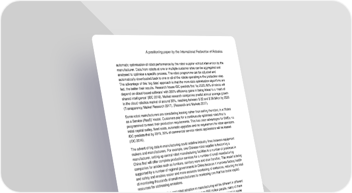 A positioning paper by the International Federation of Robotics automatic optimisation of robot performance by the robot supplier without intervention by the manufacturer. Data from robots at one or multiple customer sites can be aggregated and analysed to optimise a specific process. The robot programme can be adjusted and automatically downloaded back to one or all of the robots operating in the production step. The advantage of this ‘big data’ approach is that the more data optimisation algorithms are fed, the better their results. Research house IDC predicts that ‘by 2020, 60% of robots will depend on cloud-based software’ with 200% efficiency gains in being linked to a ‘mesh of shared intelligence’ (IDC 2016). Market research companies predict annual average growth in the cloud robotics market of around 30%, reaching between $ 22 and $ 36 billion by 2025 (Transparency Market Research 2017), (Research and Markets 2017). Some robot manufacturers are considering leasing rather than selling the robot, in a ‘Robot as a Service (RaaS)’ model. Customers pay for a continuously optimised robot that is programmed to meet their production requirements. This has clear advantages for SMEs; no initial capital outlay, fixed costs, automatic upgrades and no requirement for robot operators. IDC predicts that by 2019, 30% of commercial service robotic applications will be leased (IDC 2016). The advent of big data in manufacturing could redefine industry lines between equipment makers and manufacturers. For example, one Chinese robot supplier is becoming a manufacturer, setting up central robot manufacturing facilities in a number of provinces in China that will offer complete production services for a number of small manufacturing companies for articles such as furniture, sanitary ware and door handles. This model is being supported by a number of regional governments in China because it improves factory health and safety and enables easier and more accurate monitoring of emissions, reducing the load of monitoring thousands of small manufacturers to monitoring one that has better capital resources for addressing emissions. The impact of automation and robot adoption in manufacturing will be different in different economies. In ASEAN countries, which comprise over 600 million people, many of them manufacturing workers, automation is likely to lead to job or task displacement in some manufacturing sectors such as textiles, according to the International Labour Organisation. However, in electrical and electronics (E&E) manufacturing, one of ASEAN’s most prominent sectors and a mainstay of economic growth10 the trend is towards collaborative robots which support rather than displace workers. Because ASEAN’s E&E sector and subsectors possess a formidable and established nexus of producers and suppliers, the world’s high demand for IoT devices and components presents a significant growth opportunity (International Labour Organisation 2016). For all the promise of and hype around smart factories and Industry 4.0, progress is as yet relatively slow. Surveys by various management consultancies show adoption rates by manufacturers of robotics and automation of 15 – 37%, predicted to grow to around 50% over the next three years (PwC 2017), (MHI 2017). One issue hindering faster adoption is that large manufacturers run a huge number of different software systems, most of which are not compatible. Software systems of manufacturers, suppliers, and customers are rarely 10 .ASEAN’s E&E exports almost tripled over the past decade, reaching US $382.1 billion in 2014 according to the ILO. 9 Positioning Paper March 2018