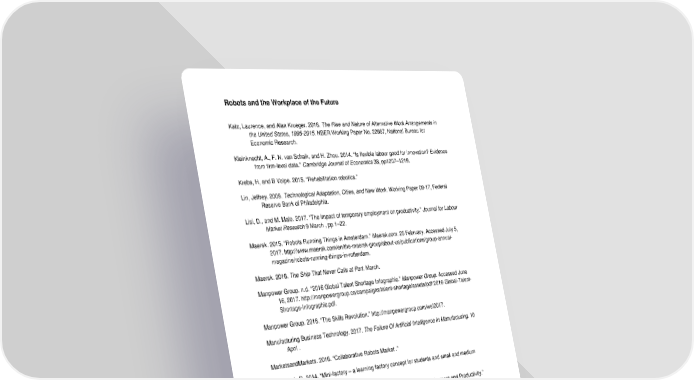 Robots and the Workplace of the Future Katz, Laurence, and Alan Krueger. 2016. The Rise and Nature of Alternative Work Arrangements in the United States, 1995-2015. NBER Working Paper No. 22667, National Bureau for Economic Research. Kleinknecht, A., F. N. van Schaik, and H. Zhou. 2014. “Is flexible labour good for innovation? Evidence from firm-level data.” Cambridge Journal of Economics 38, pp1207–1219. Krebs, H, and B Volpe. 2015. “Rehabilitation robotics.” Lin, Jeffrey. 2009. Technological Adaptation, Cities, and New Work. Working Paper 09-17, Federal Reserve Bank of Philadelphia. Lisi, D., and M. Malo. 2017. “The impact of temporary employment on productivity.” Journal for Labour Market Research 9 March , pp 1–22. Maersk. 2015. “Robots Running Things in Amsterdam.” Maersk.com. 25 February. Accessed July 5, 2017. http://www.maersk.com/en/the-maersk-group/about-us/publications/group-annual- magazine/robots-running-things-in-rotterdam. Maersk. 2016. The Ship That Never Calls at Port. March. Manpower Group. n.d. “2016 Global Talent Shortage Infographic.” Manpower Group. Accessed June 16, 2017. http://manpowergroup.ca/campaigns/talent-shortage/assets/pdf/2016-Global-Talent- Shortage-Infographic.pdf. Manpower Group. 2016. “The Skills Revolution.” http://manpowergroup.com/wef2017. Manufacturing Business Technology. 2017. The Failure Of Artificial Intelligence In Manufacturing. 10 April . MarketsandMarkets. 2016. “Collaborative Robots Market .” Matt et.al., D. 2014. “Mini-factory – a learning factory concept for students and small and medium sized enterprises,.” McKinsey Global Institute. 2017. “A Future That Works: Automation, Employment and Productivity.” McKinsey Global Institute. 2017. “Measuring the Economic Impact of Short-Termism .” McKinsey Global Institute. 2016. Poorer Than Their Parents: Flat or Falling Incomes in Advanced Economies. McKinsey Global Institute. McKinsey. 2015. “Unlocking the Potential of the Internet of Things .” METR. 2015. Japan's Robot Strategy. Ministry of Economy, Trade and Industry. MHI. 2017. “The 2017 Annual Industry Report Next-Generation Supply Chains: Digital, On-Demand and Always-On.” Michaels, Guy, Ashwini Natraj, and John Van Reenen. 2014. “Has ICT polarized skill demand? Evidence from eleven countries over 25 years.” Review of Economics and Statistics, , No. 96,pp. 60-77. Ministry of Economy, Trade and Industry, Japan. 2015. Japan's Robot Strategy. Ministry of Economy, Trade and Industry. Modern Materials Handling. 2017. “The State of Automation.” March 2018 Positioning Paper 32