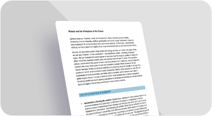 Robots and the Workplace of the Future spiritual essence. However, much of it is economic. Many societies are confronting increasing income inequality, political polarisation and social unrest. Automation makes an easy scapegoat for concerns about jobs and income security. Furthermore, robots literally embody our fears about the fragility of our long-uncontested role as overlords of planet Earth. No-one can accurately predict today where technology will take us in 50 or 100 years. What we can say, however, is how automation – and specifically robots - are being employed today. We can forecast with some degree of accuracy how the ongoing uptake of robots will affect industries, business models, jobs and workers over the next 10 years. It is a positive picture, one in which the quality of work, and remuneration for it, improves, new job types are created, and many more types of work are available to people whose access to the job market has been limited by physical disability or by declining physical strength in old age. It is a picture in which small-to-medium-sized companies (SMEs), which account for over 90% of businesses in most economies, are better able to compete, and to assume new roles in global supply chains. It is also a future for which most societies are currently unprepared. Shrinking workforces due to ageing populations in developed economies are compounded by skills shortages in the existing workforce in many industry sectors. THE IFR’S POSITION IN SUMMAR Y • Automation is driving job creation. Despite fears reflected in media articles, there is no concrete evidence that automation is different in its impact on employment from the previous waves of technology-driven change over the centuries which led to a mix of job displacement, job creation, and changing job profiles. What may be different this time is the pace of change in job profiles and skills requirements which seems to be faster than in the past, as evidenced by the fact that, according to recruitment company Manpower, 65% of the jobs that today’s children will perform do not exist yet. This aggressive pace of change combines with the effects of globalisation - particularly the outsourcing of jobs to cheaper countries and to temporary labour, with an ensuing decline in job security and downward pressure on wages in many job types – to create insecurity. • Human labour will remain competitive. The fact that tasks can be automated in theory by no means implies they will be in practice – the decision to do this will be influenced by many factors, including the size of company and geography as well as the cost and payback period of investing in automation technologies. Most experts believe humans will remain central to successful automation strategies. Research by the OECD shows that companies that employ technology effectively are ten times more productive than those that do not. Companies must assess where technology can bring highest returns, as well as where human experience, even in routine tasks, provides competitive advantage. • Most experts in the three industries covered in this report – manufacturing, logistics and healthcare - predict a future in which humans and machines will work together. Productivity increases and competitive advantage will increasingly depend on a company’s ability to design and implement processes in which humans and machines work together. • Automation can create rewarding (in terms of both job satisfaction and salary) job profiles for workers in the three industries covered in this report. A higher variety of tasks, work in multi-disciplinary teams, de-centralised management structures, and March 2018 Positioning Paper 2