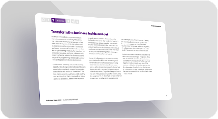 1 2 AI and Me 3 4 5 #TECHVISION2020 Transform the business inside and out Advances in AI are letting organizations build is merely reading off of the slides and provide offer live insights about how a customer is feeling interactive, adaptable and intelligent systems feedback on how often filler words (“um” and “ah”) and provide guidance to the call agent on how that collaborate with human employees to help are used or insensitive phrases like “best man for to improve the experience. This collaboration them reach their goals. While this collaboration the job.” Microsoft’s presentation coach isn’t just between human employees and AI not only offers is valuable across the organization, businesses an automated system; it collaborates with individual the call agents real-time coaching, but also helps are finding it’s especially transformative for their employees, using live feedback to help them learn identify future coaching opportunities for them. learning and training initiatives. Far more than just and improve their speaking. What’s more, every streamlining existing methods, collaborative AI employee with PowerPoint can use it. Sophisticated systems that interact and collaborate coaching has the potential to democratize and with humans are becoming an integral part of the expand HR programming, while creating entirely Human-AI collaboration is also creating training work environment, generating ideas and solutions new strategies for employee development. opportunities that didn’t exist before. Cogito, a just like their human counterparts. It’s a new kind behavioral science software company, is using of partnership that impacts every level of the Collaborative AI training can provide learning voice-to-text and sentiment analysis to coach business, and leaders will see that opportunities opportunities at unprecedented scale. Microsoft human call center agents in empathy during their for collaborative AI are both external and internal. 19 recently launched an AI-powered presentation phone calls with customers. When a customer AI training is just the start. In the future, collaboration 18 coach for its web version of PowerPoint. The calls with a question, Cogito lets the agents know in between humans and AI will transform the business tool assists presenters with pace, slide reading real time if they are speaking too fast or interrupting inside and out. and wording. It can track how quickly or slowly the customer. The AI-driven tech can also recognize someone is speaking, detect when a person the emotion and inflection in people’s voices, Technology Vision 2020 | We, the Post-Digital People 55