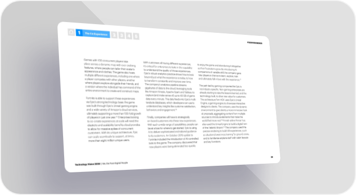 1 The I in Experience 2 3 4 5 #TECHVISION2020 Games with 100 concurrent players take With customers all having different experiences, to enjoy the game and abandoning it altogether place across a dynamic map with ever-evolving it’s critical for enterprises to bake in the capability as their frustrations grew. By introducing AI features, where people can tailor their avatar’s to understand the quality of those experiences. companions of variable skill, the company gave appearance and clothes. The game also hosts Epic’s robust analytics practice shows how to look new players a chance to learn, explore, train multiple different experiences, including one where beyond just what the experience is today, to how and ultimately fall in love with the experience.47 a player competes with other players, another to transform constantly and improve over time. where players explore alongside their friends, and The company’s analytics pipeline streams The path laid by gaming companies like Epic is a version where the individual has command of the gigabytes of data to the cloud, leveraging tools not industry specific. Non-gaming enterprises are entire environment to create and construct maps. like Amazon Kinesis, Apache Spark and Tableau to already starting to take the lessons learned, and the capture (and make sense of) up to 40 GB of game technology built, to drive new value for customers. Fortnite is able to support these experiences data every minute. This data feeds into Epic’s multi- The architecture firm HOK uses Epic’s Unreal via Epic’s strong technology base: the game terabyte databases, which developers can use to Engine, a gaming engine to showcase interactive was built through Epic’s Unreal gaming engine understand key insights like customer satisfaction, designs to clients. The company uses the dynamic 46 and a wide variety of Amazon’s cloud services, behaviors and engagement. environment to give clients a more immersive look ultimately supporting a more than 100-fold growth at proposals, aggregating content from multiple 45 of players in just one year. Enterprises looking Finally, companies will have to strategically sources to introduce elements that make the 48 to co-create experiences at scale will need the on-board customers into these new experiences. world feel more real. Finnish airline Finnair has elasticity and scalability benefits cloud provides With such a wide range of possibilities, people can also used the Unreal Engine to build a digital twin 49 to allow for massive spikes of concurrent be at a loss for where to get started. Epic is using of the Helsinki Airport. The company used this customers. With its unique architecture, Epic AI to deliver sophisticated and tailored guidance precise rendering to build VR experiences, such can scale seamlessly to support, at times, to its customers. An October 2019 update to as situational awareness training for ground crews, more than eight million unique users. Fortnite included the introduction of AI-controlled and to familiarize airplane staff with cabin layouts bots to the game. The company discovered that and key functions. new players were being eliminated too quickly Technology Vision 2020 | We, the Post-Digital People 39