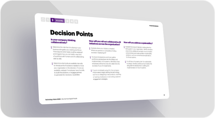 1 2 AI and Me 3 4 5 #TECHVISION2020 Decision Points Is your company thinking How will you roll out collaborative AI How will you address explainability? collaboratively? initiatives across the organization? Evaluate the scope of decision-making that AI is Determine the role that AI is playing in your E valuate where your industry is headed. being given in your organization. Identify sensitive business alongside your existing workforce. Where are partners or competitors finding areas where additional oversight may be needed Think beyond which tasks could be replaced success in deploying AI? and prioritize post-implementation explainability and imagine how you can build a new kind solutions, such as counterfactual explanations, of workforce with humans and AI collaborating T o ensure transparency and trust, gather for those systems. side by side. workforce perspectives into the design and implementation of AI systems. Ultimately, these For all future AI projects, plan for explainability Determine what tools are available internally employees will be the ones who determine the by design. Develop policies and principles that to introduce the AI solutions needed to move success of your AI investments. will guide the development, building and your organization in this direction. If none are implementation of new AI systems. available, evaluate if employees have the skills If y ou’re not already using AI in the company, to build the solutions, or engage partners find an area to begin piloting the technology, to generate the necessary capabilities. such as co-designing a new product, coaching or training employees or reinventing customer engagement strategies. Technology Vision 2020 | We, the Post-Digital People 61