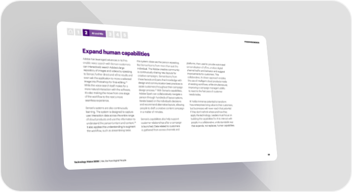 1 2 AI and Me 3 4 5 #TECHVISION2020 Expand human capabilities Adobe has leveraged advances in NLP to the system observes the person repeating. platforms, then used to provide automated enable voice search with Sensei: customers But Sensei learns from more than just the personalization of offers, analyze digital can interactively search Adobe’s large individual. The Adobe creative community channel traffic and behavior and suggest repository of images and videos by speaking is continuously sharing new layouts for improvements for customers. This to Sensei, further direct and refine results and creative campaigns. Sensei learns from collaborative, AI-driven approach enables even ask the application to move a selected these layouts and pairs that knowledge with the use of intelligent cloud products inside 35 image into Photoshop for final editing. design and communication best practices to of existing workflows, while simultaneously While the voice search itself makes for a assist customers throughout their campaign improving a campaign manager’s ability 37 more natural interaction with the software, design process. With Sensei’s capabilities, to react to the fast pace of customer it’s also making the move from one stage Adobe Spark can collaboratively navigate a needs today. of the workflow to the next a more person through hundreds of layout options, seamless experience. iterate based on the individual’s decisions AI holds immense potential to transform and recommend alternative layouts, allowing how enterprises bring value to their customers, Sensei’s systems are also continuously people to draft a creative content campaign but businesses will never reach that potential learning. The system is designed to capture in a matter of minutes. if they don’t rethink where and how they user interaction data across the entire range apply the technology. Leaders must focus on of cloud products and use this information to Sensei’s capabilities also help support building the capabilities for AI to interact with 36 understand the person’s intent and context. customer relationships after a campaign people in a collaborative, understandable way It also applies this understanding to augment is launched. Data related to customers that expands, not replaces, human capabilities. the workflow, such as streamlining tasks is gathered from across channels and Technology Vision 2020 | We, the Post-Digital People 59