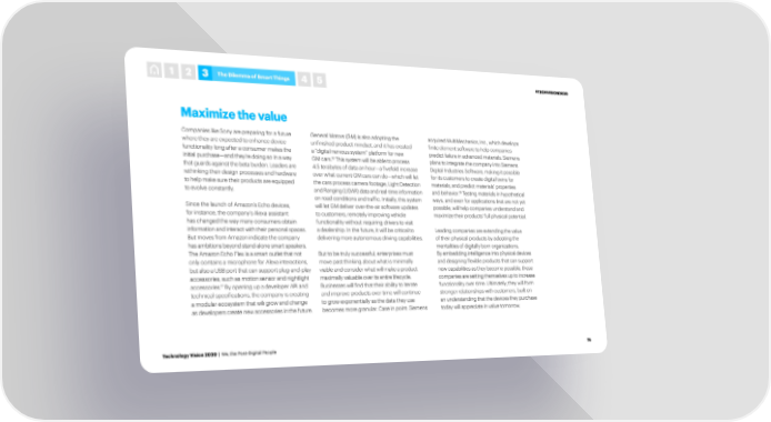 1 2 3 The Dilemma of Smart Things 4 5 #TECHVISION2020 Maximize the value Companies like Sony are preparing for a future General Motors (GM) is also adopting the acquired MultiMechanics, Inc., which develops where they are expected to enhance device unfinished product mindset, and it has created finite element software to help companies functionality long after a consumer makes the a “digital nervous system” platform for new predict failure in advanced materials. Siemens 18 initial purchase—and they’re doing so in a way GM cars. This system will be able to process plans to integrate the company into Siemens that guards against the beta burden. Leaders are 4.5 terabytes of data an hour—a fivefold increase Digital Industries Software, making it possible rethinking their design processes and hardware over what current GM cars can do—which will let for its customers to create digital twins for to help make sure their products are equipped the cars process camera footage, Light Detection materials, and predict materials’ properties 19 to evolve constantly. and Ranging (LIDAR) data and real-time information and behavior. Testing materials in hypothetical on road conditions and traffic. Initially, this system ways, and even for applications that are not yet Since the launch of Amazon’s Echo devices, will let GM deliver over-the-air software updates possible, will help companies understand and for instance, the company’s Alexa assistant to customers, remotely improving vehicle maximize their products’ full physical potential. has changed the way many consumers obtain functionality without requiring drivers to visit information and interact with their personal spaces. a dealership. In the future, it will be critical to Leading companies are extending the value But moves from Amazon indicate the company delivering more autonomous driving capabilities. of their physical products by adopting the has ambitions beyond stand-alone smart speakers. mentalities of digitally born organizations. The Amazon Echo Flex is a smart outlet that not But to be truly successful, enterprises must By embedding intelligence into physical devices only contains a microphone for Alexa interactions, move past thinking about what is minimally and designing flexible products that can support but also a USB port that can support plug-and-play viable and consider what will make a product new capabilities as they become possible, these accessories, such as motion sensor and nightlight maximally valuable over its entire lifecycle. companies are setting themselves up to increase 17 accessories. By opening up a developer API and Businesses will find that their ability to iterate functionality over time. Ultimately, they will form technical specifications, the company is creating and improve products over time will continue stronger relationships with customers, built on a modular ecosystem that will grow and change to grow exponentially as the data they use an understanding that the devices they purchase as developers create new accessories in the future. becomes more granular. Case in point: Siemens today will appreciate in value tomorrow. Technology Vision 2020 | We, the Post-Digital People 75