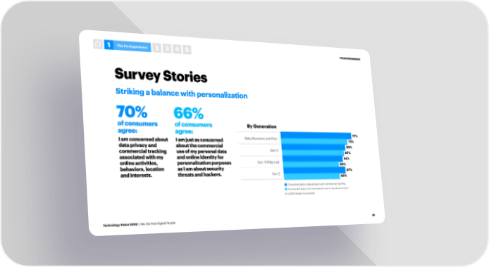 1 The I in Experience 2 3 4 5 #TECHVISION2020 Survey Stories Striking a balance with personalization 70% 66% of consumers of consumers By Generation agree: agree: 77% I am concerned about I am just as concerned Baby Boomers and Prior 72% data privacy and about the commercial 69% commercial tracking use of my personal data Gen X 67% associated with my and online identity for 65% online activities, personalization purposes Gen Y/Millennial 60% behaviors, location as I am about security 67% and interests. threats and hackers. Gen Z 60% Concerned about data privacy and commercial tracking Concerned about the commercial use of my personal data N=2,000 Global Consumers Technology Vision 2020 | We, the Post-Digital People 36