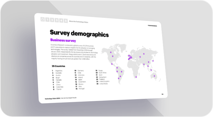 1 2 3 4 5 About the Technology Vision #TECHVISION2020 Survey demographics Business survey Accenture Research conducted a global survey of 6,074 business and IT executives to capture insights into the adoption of emerging technologies. The survey, fielded from November 2019 through January 2020, helped identify the key issues and priorities for technology adoption and investment. Respondents were C-level executives and directors at companies across 25 countries and 21 industries, with the majority having annual revenues greater than US$5 billion. 25 Countries 1 Argentina 10 Germany 19 Russia 2 Australia 11 India 20 South Africa 3 Austria 12 Indonesia 21 Spain 4 Brazil 13 Ireland 22 Switzerland 5 Canada 14 Japan 23 Thailand 6 Chile 15 Kazakhstan 24 United Kingdom 7 China 16 Mexico 25 United States 8 Colombia 17 Peru 9 France 18 Portugal Technology Vision 2020 | We, the Post-Digital People 129