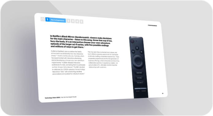 1 The I in Experience 2 3 4 5 #TECHVISION2020 In Netflix’s Black Mirror: Bandersnatch, viewers make decisions for the main character—listen to this song, throw that cup of tea, bury the body. It’s an interactive choose-your-own-adventure episode of the larger sci-fi series, with five possible endings 1,2 and millions of ways to get there. Audience feedback was so positive that Netflix This may seem like an entertainment industry fad, announced it would develop two new interactive but it reflects a growing opportunity for businesses 3,4 shows. And it’s not the only one. YouTube, which of all kinds: building cooperative experiences. These has experimented with interactive advertising, cooperative experiences are the next generation of started developing a choose-your-own-adventure business offerings, where enterprises are becoming 5 original series. Audible released interactive collaborative partners in experience creation, not audiobooks for kids, prompting them to participate just providers of it—ultimately transforming their 6 via their Amazon Echo devices. The BBC decided relationships with customers. to celebrate the 1,000th episode of its technology news show “Click” with a branching narrative, 7 personalized and localized for individual viewers. Technology Vision 2020 | We, the Post-Digital People 24